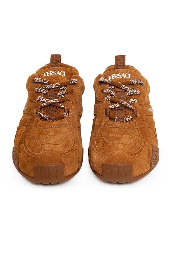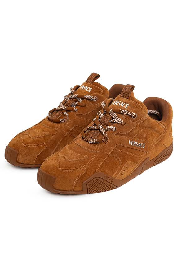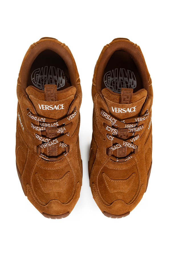 - Замшеві кросівки на шнурівці, тиснений логотип Versace на язичці та п'яті, петля з візерунком Greca на язичку, логотип Galaxia на устілці, візерунок Greca на підошві
