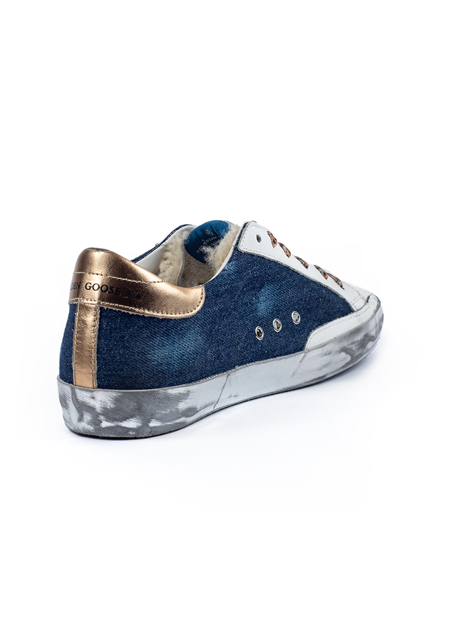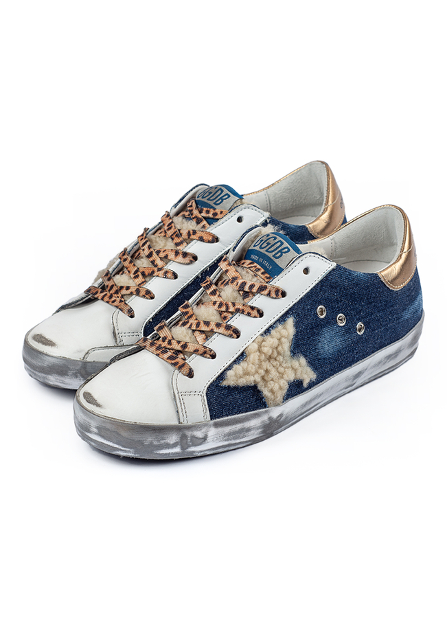 - Кросівки джинсові з шкіряним носком і зіркою з хутра, леопардовий шнурок, контрастна п'ята