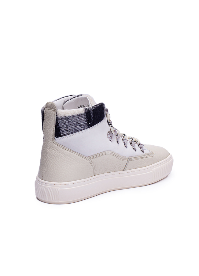 Високоякісні шкіряні кросівки із замшевою вставкою кольору льоду та вовняним браслетом з двоколірним візерунком. Застібка на шнурки на 7 люверсів.