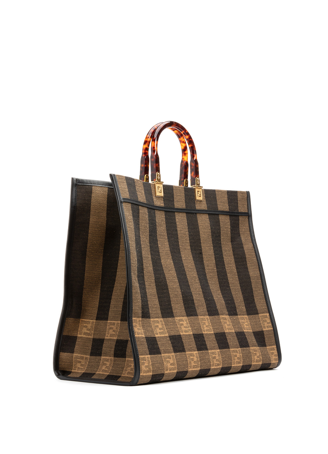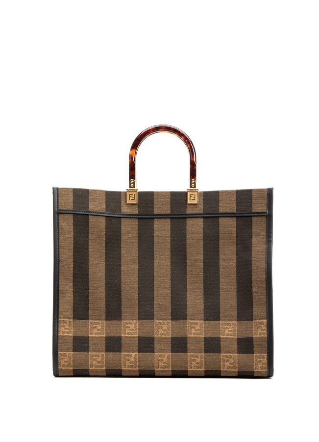 - Сумка-шопер Sunshine в смужку від Fendi. Деталі з панцира черепахи, закруглені ручки, суцільний принт з логотипами і головний внутрішній відділ.