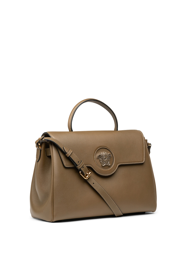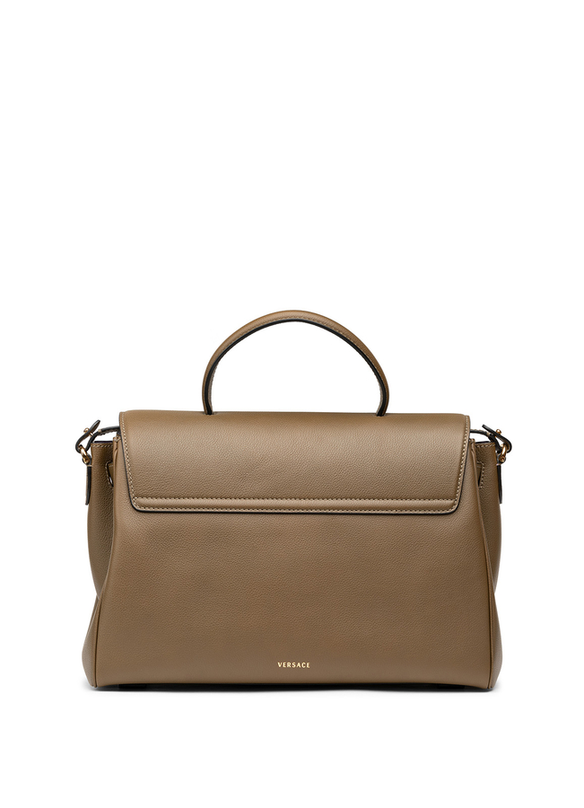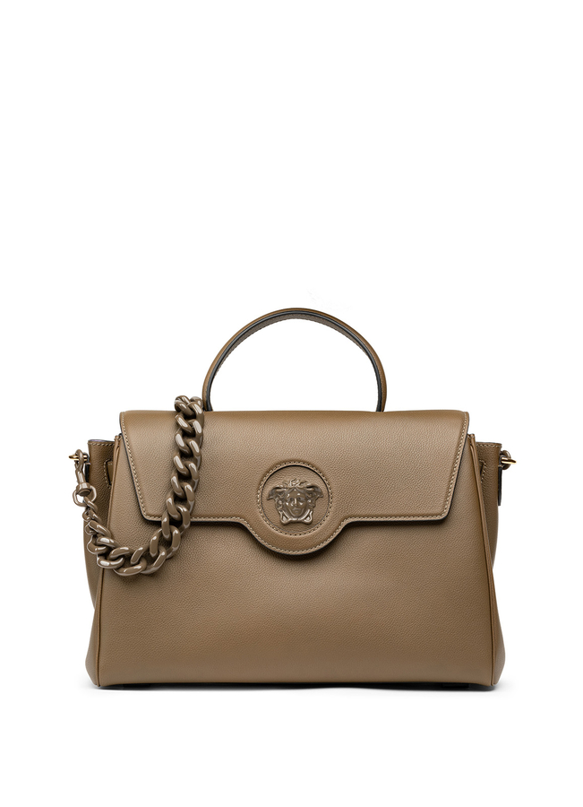 - Сумка з шкіри з довгою і короткою ручками, має додаткову ручку-ланцюжок. Доповнена декором Medusa.