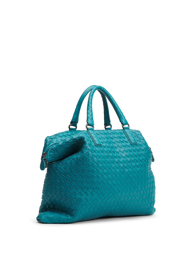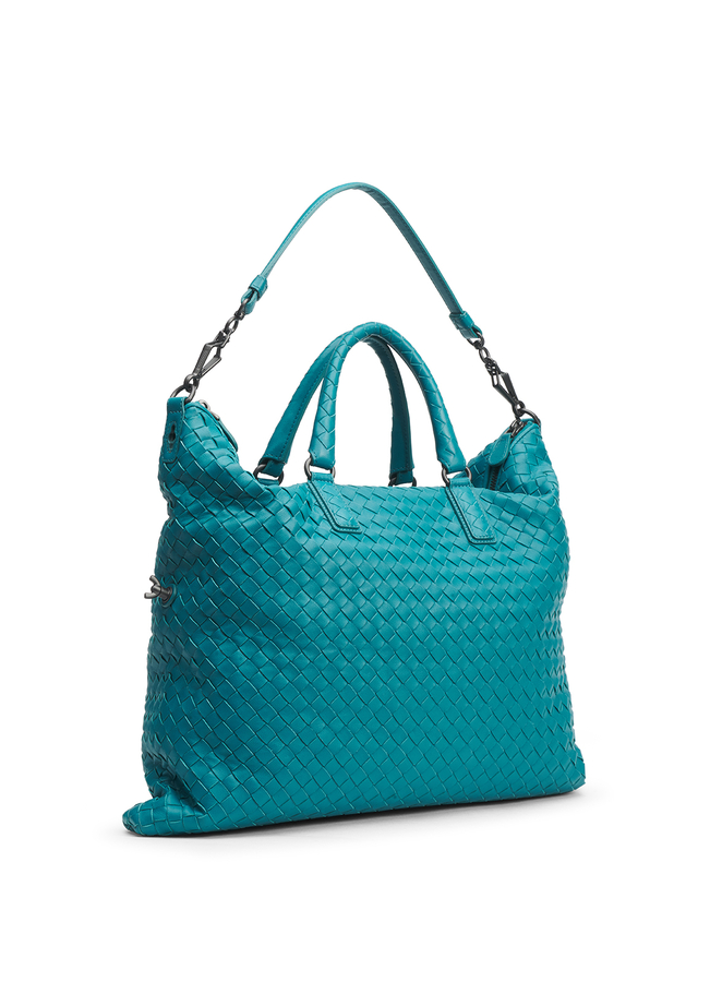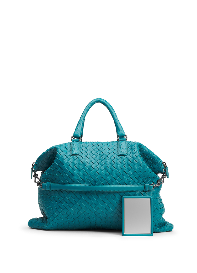 - Шкіряна сумка-шопер, виконана з плетінням Intrecciato. Прямокутної форми, з двома верхніми круглими ручками і ремнем через плече. Застібка на блискавку.
