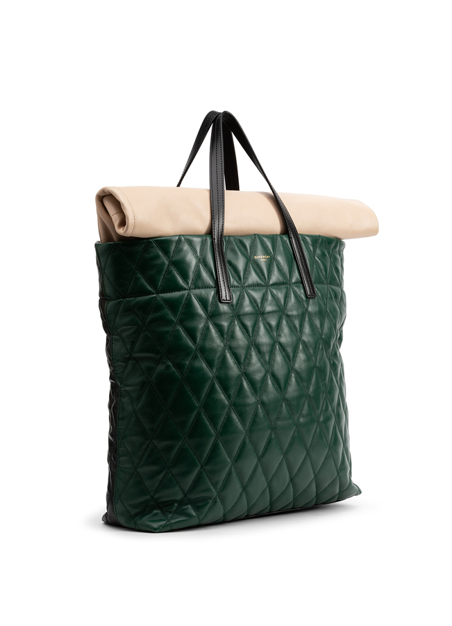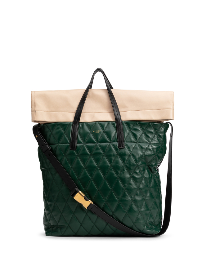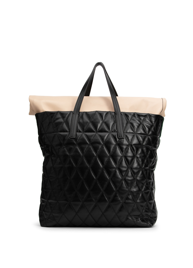 - Стьобана шкіряна сумка-шопер. Двуколорова, стьобана формою ромбів, на блискавці зверху, логотип надрукован зверху, золотиста фурнітура, біле полотно відстьобується, ручки, регульований плечовий ремінь.