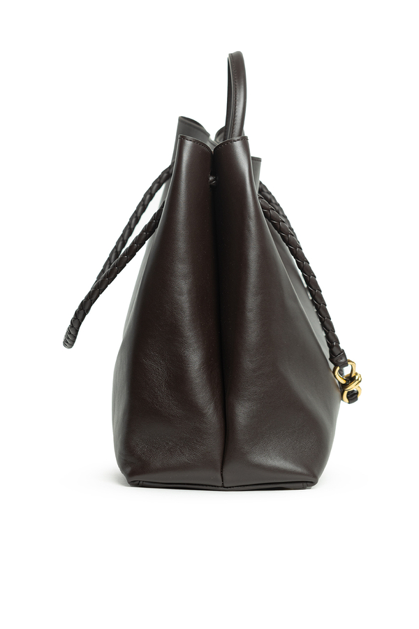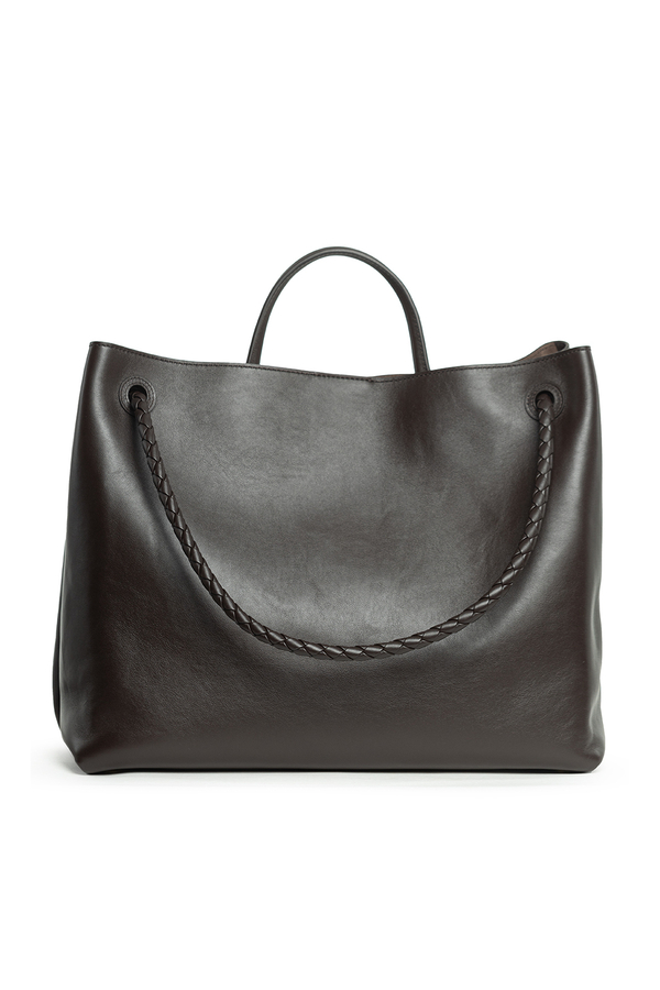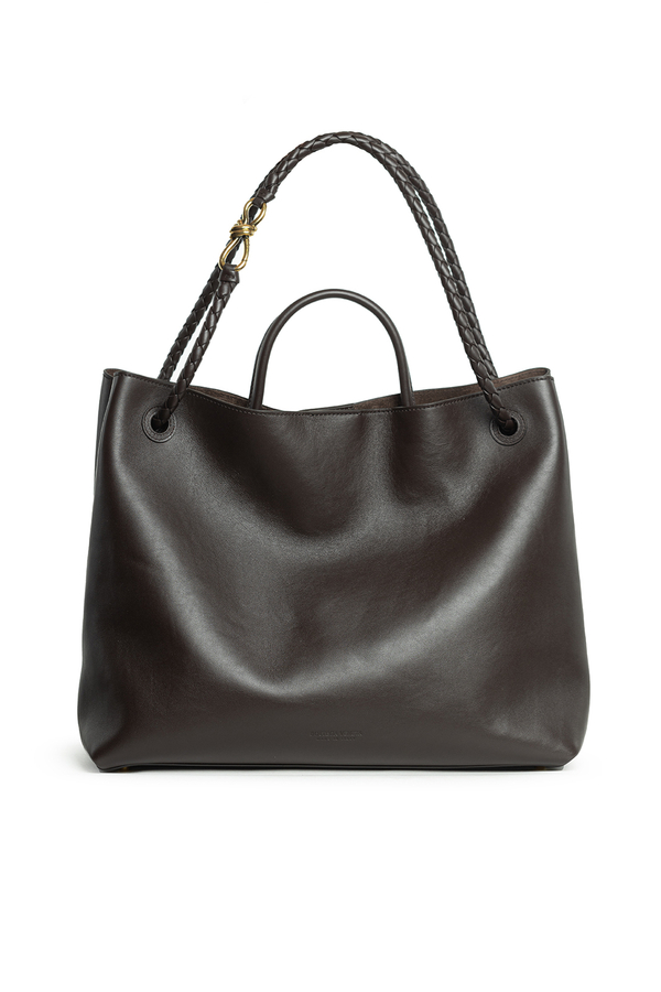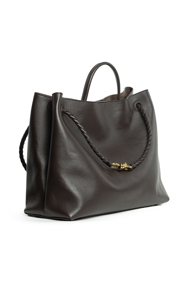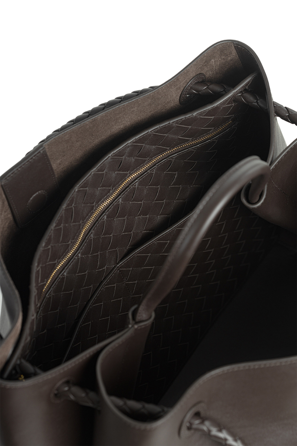 - Велика шкіряна сумка Andiamo з верхньою ручкою, фірмовим вузлом і ременем, що ковзає, внутрішня кишеня із плетінням Intrecciato, магнітна застібка