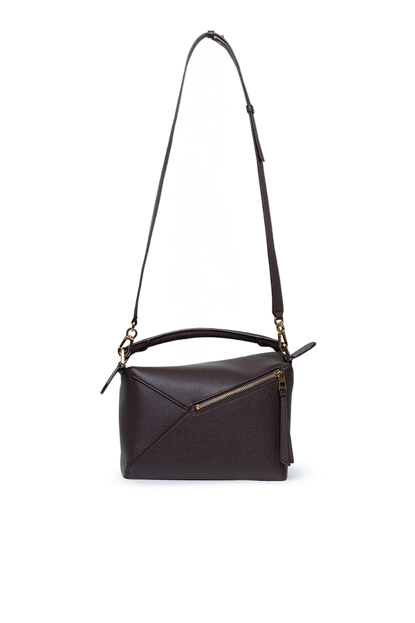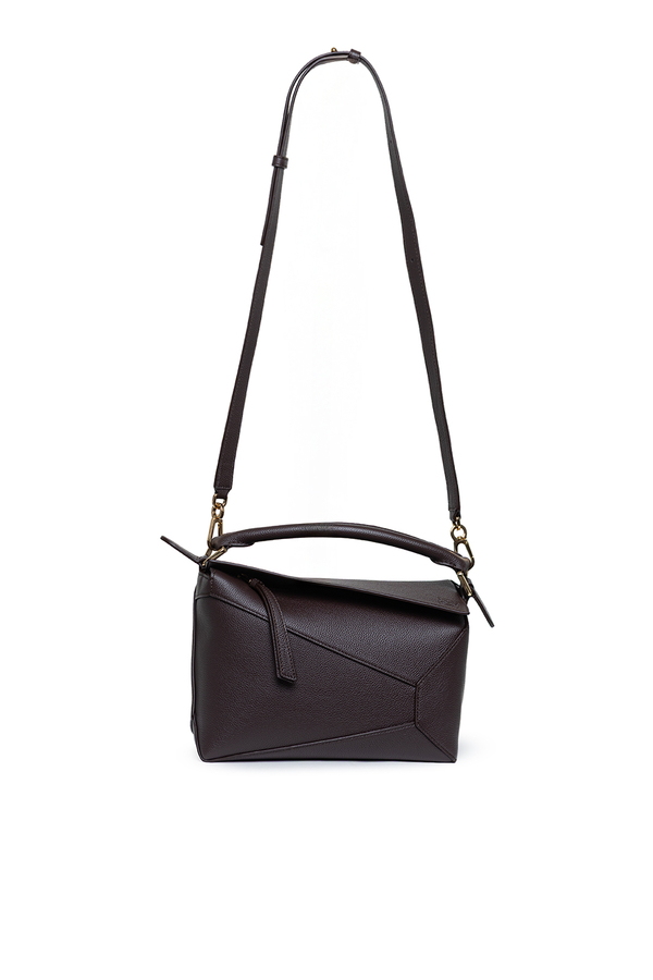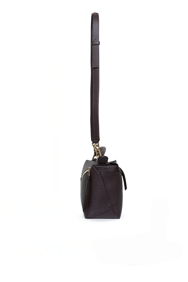 - Шкіряна сумка Puzzle Edge, кубоподібна форма, геометричні лінії, знімний та регульований ремінь, застібка-блискавка, одна зовнішня задня кишеня на блискавці, одна внутрішня кишеня, тиснена анаграма