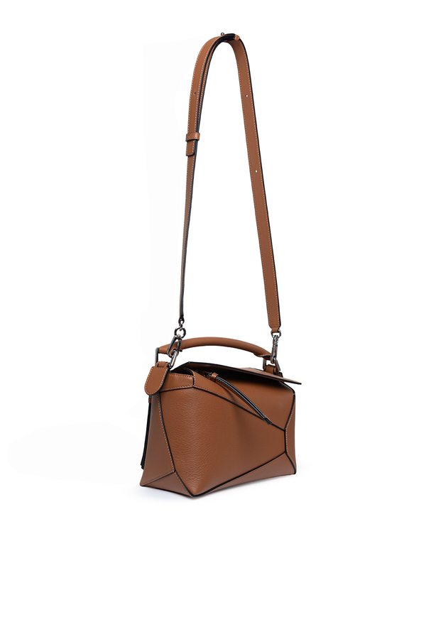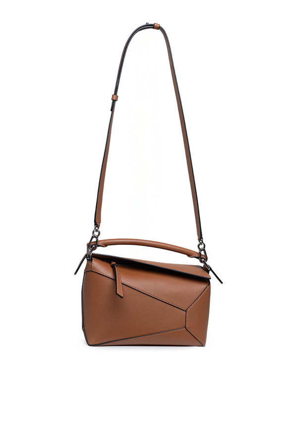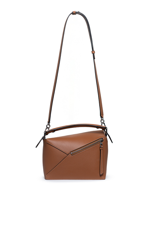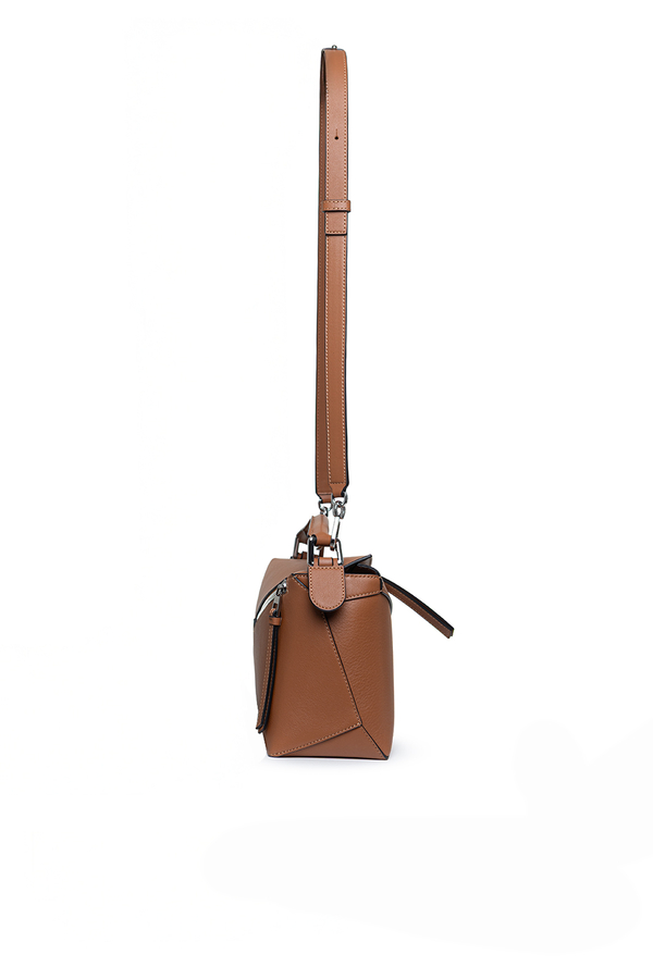 - Шкіряна сумка Puzzle Edge, кубоподібна форма, геометричні лінії, знімний та регульований ремінь, застібка-блискавка, одна зовнішня задня кишеня на блискавці, одна внутрішня кишеня, тиснена анаграма