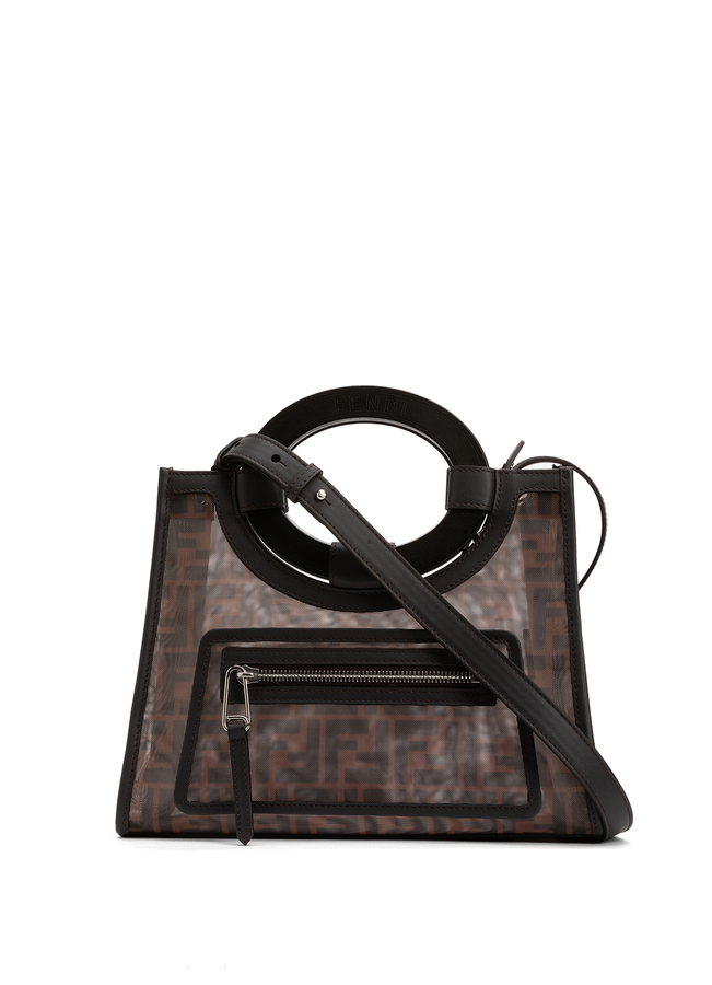 - Маленька сумка-шопер Runaway від Fendi. Верхні круглі ручки і одна довга через плече. Дизайн з логотипами і відкритим верхом.