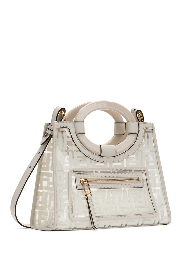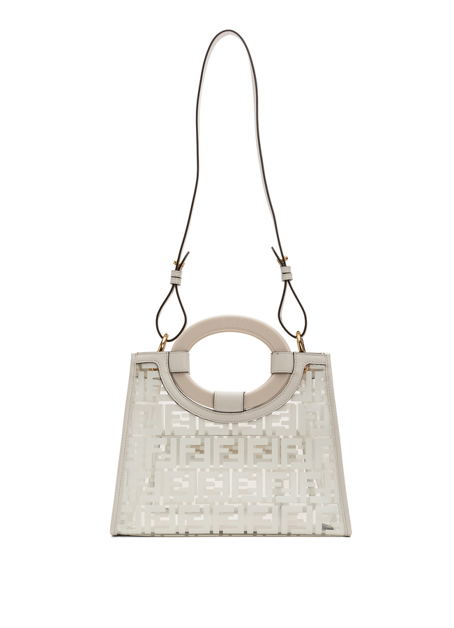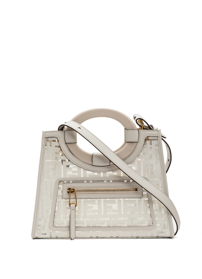 - Маленька сумка-шопер Runaway від Fendi. Верхні круглі ручки и одна довга через плечі. Дизайн з логотипами и відкрітім верхом.