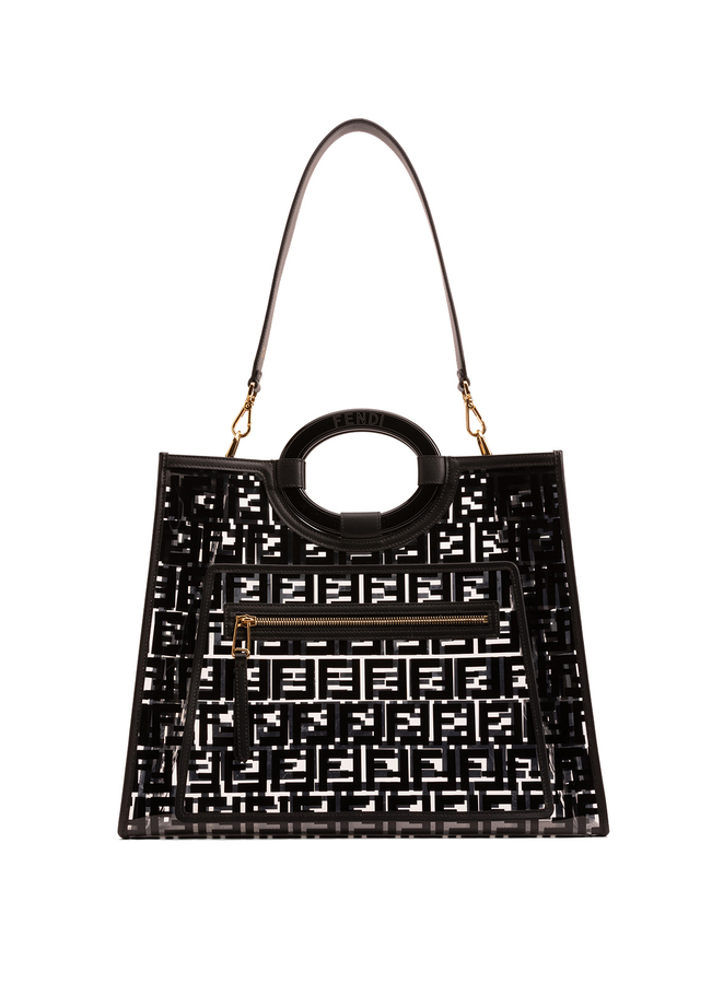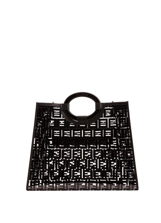 - Сумка Runaway Fendi з прозорого ПВХ з логотипом FF Fendi і короткою закругленою подвійною ручкою. Знімний регульований ремінь на плече, дизайн з відкритим верхом, головний внутрішній відділ і передня кишеня на блискавці.