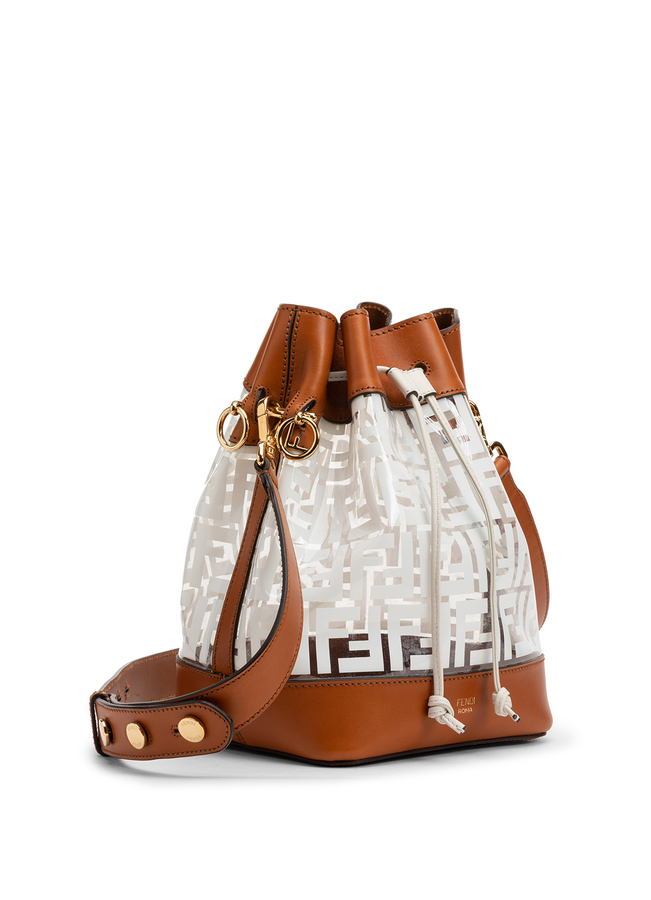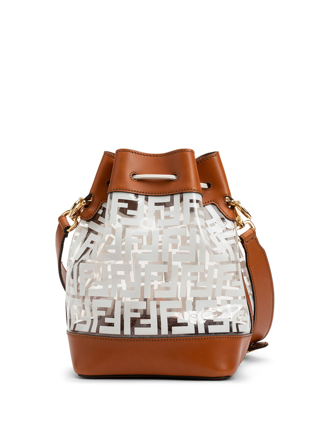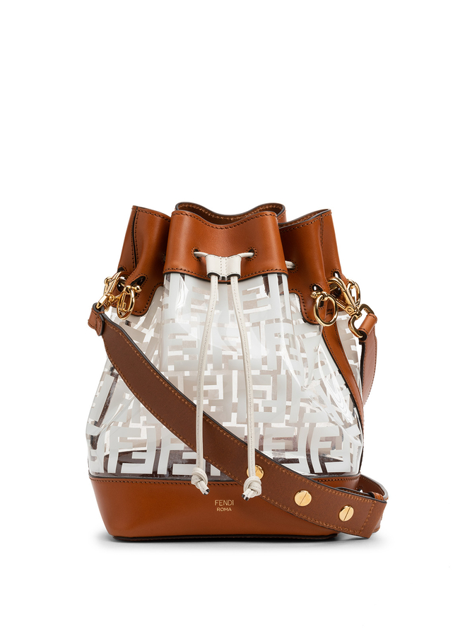 - Сумка-відро Fendi Mon Tresor. З куліскою, знімним і регульованим плечовим ременем, контрастним принтом FF, деталями з замшевої шкіри і металевими виробами із золотим покриттям.