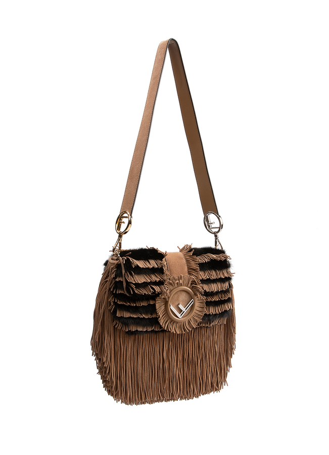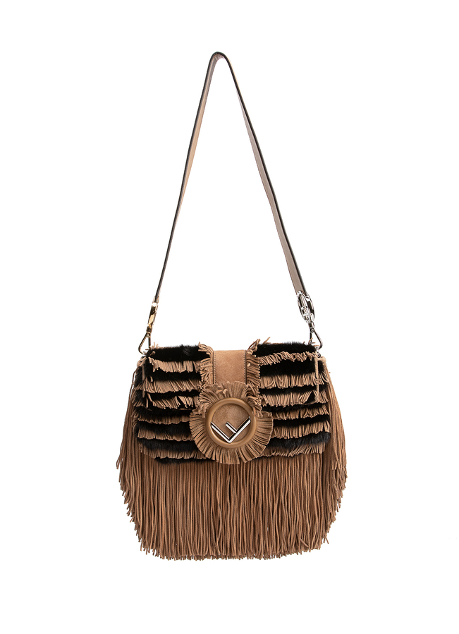 - Замшева сумка Baguette прикрашена смужками з хутра норки. З довгим і широким ременем через плече. Застібка на відкидний верхній клапан з магнітом. Прикрашена шкіряною бахромою з боків і металевим логотипом з літерою F. В середині одне відділення і кишеня на блискавці.