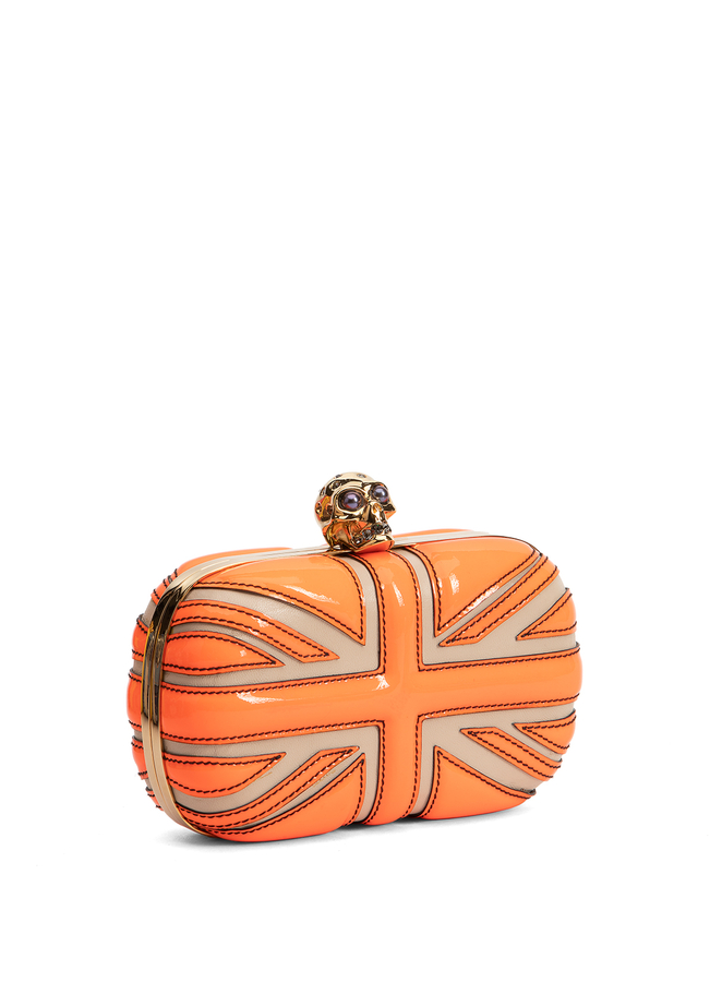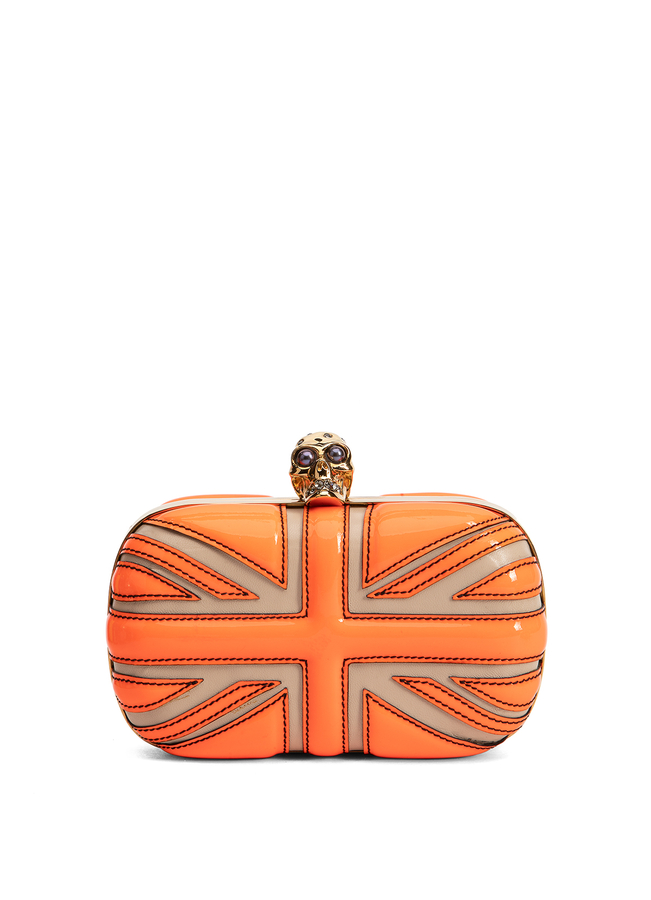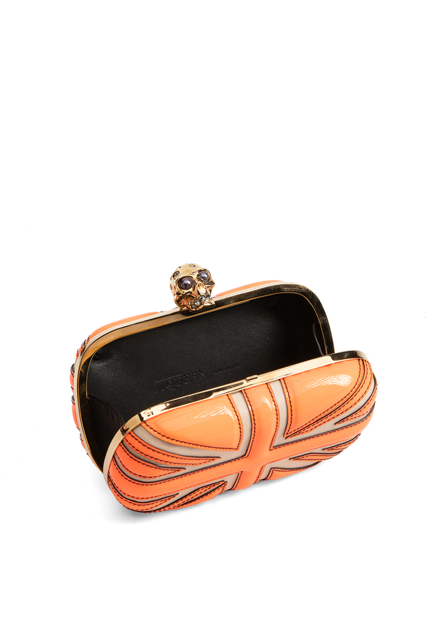 - Клатч з лакованої шкіри з аплікацією британського прапору. Металева застібка у формі черепу.