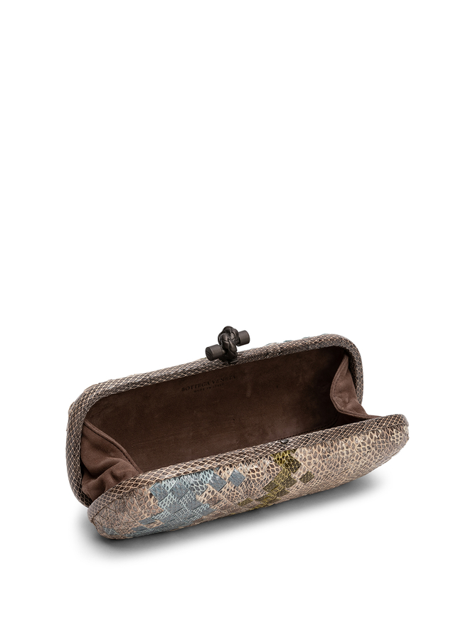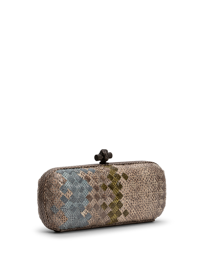 - Клатч Knot з плетінням Intrecciato з різнобарвної шкіри екзотичних рептилій. Замшева підкладка. Застібка з латуні у вигляді вузла.