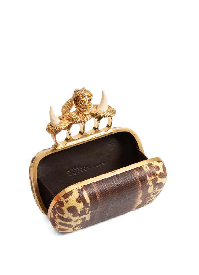- Шкіряний клатч з металевою ручкою у формі кастету, оздобленою прикрасою у формі черепу.
