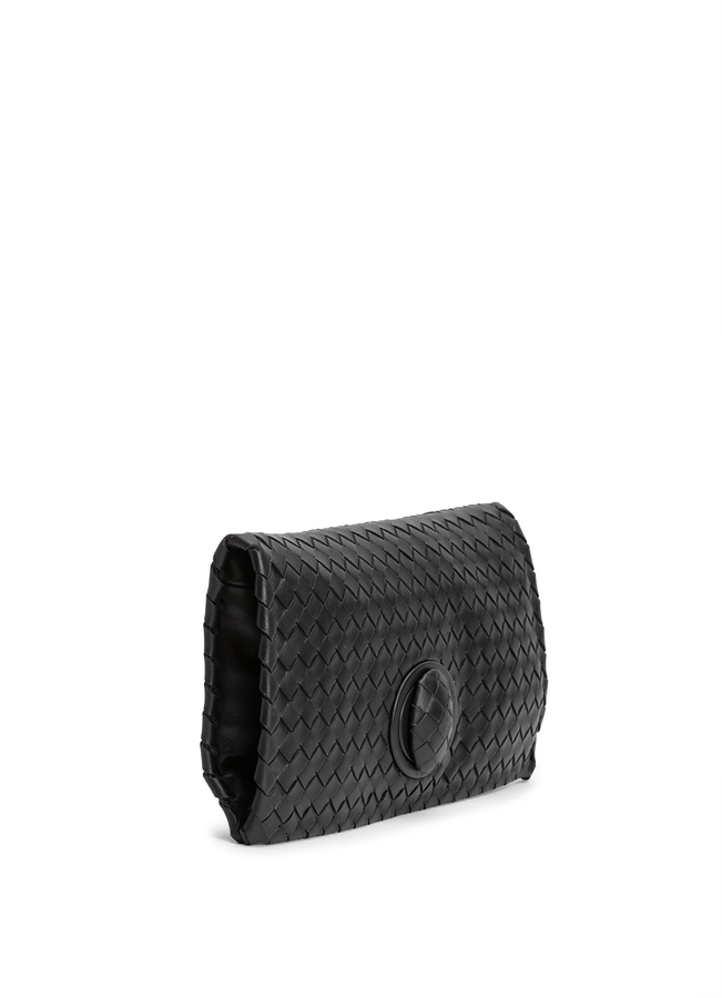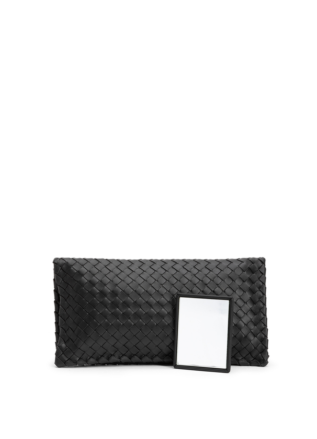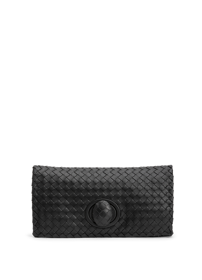 - Плетена шкіряна сумка-клатч Intrecciato від Bottega Veneta з замком і замшевою внутрішньою підкладкою.