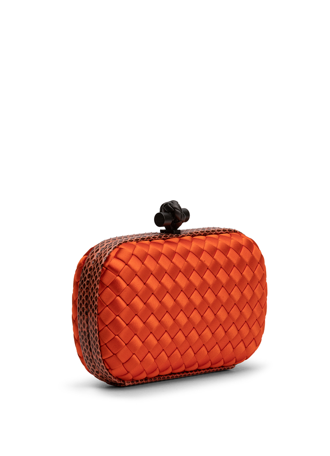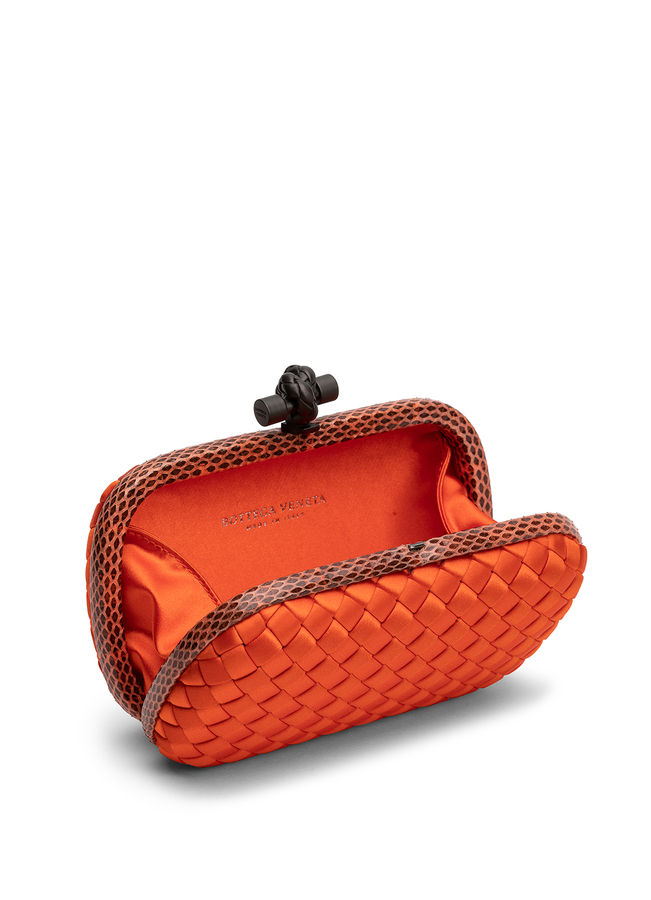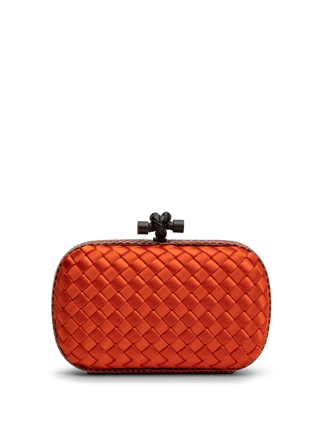 - Плетений шовковий клатч Bottega Veneta з вузлом, обтягнутий декоративною рамкою та полірованою металевою застібкою-вузлом. Підкладка з атласу.