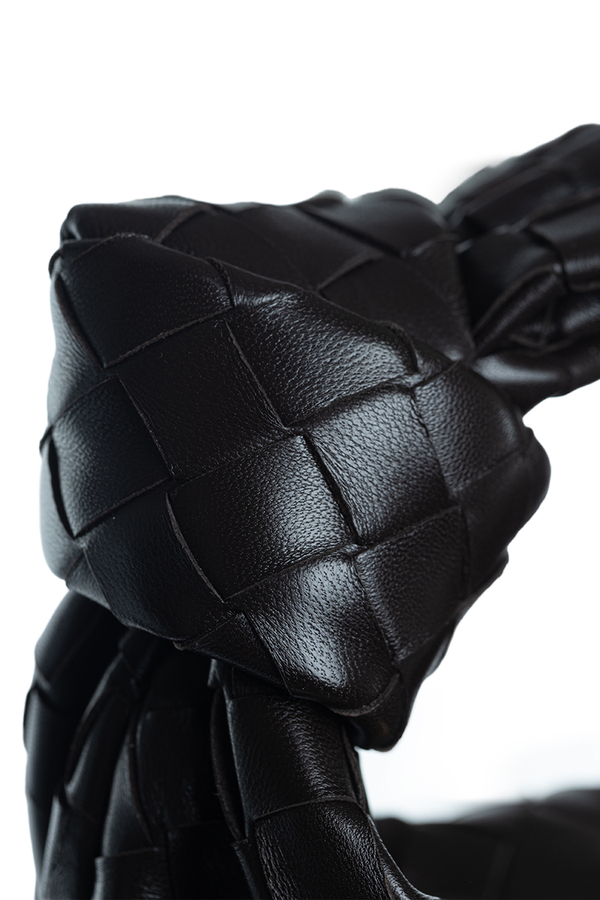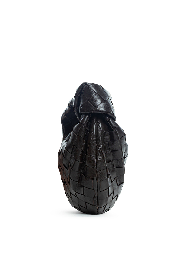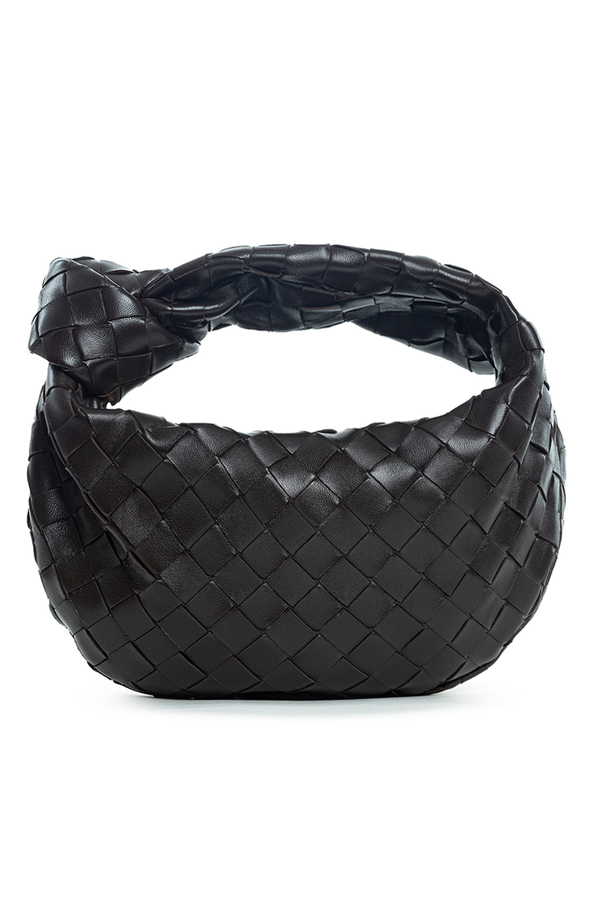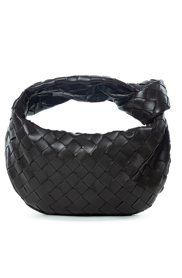 - Jodie Mini social style bag, Intrecciato weave, one compartment with clasp closure, decorative knot handle.