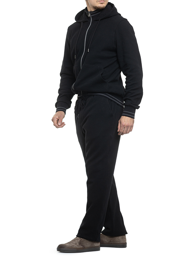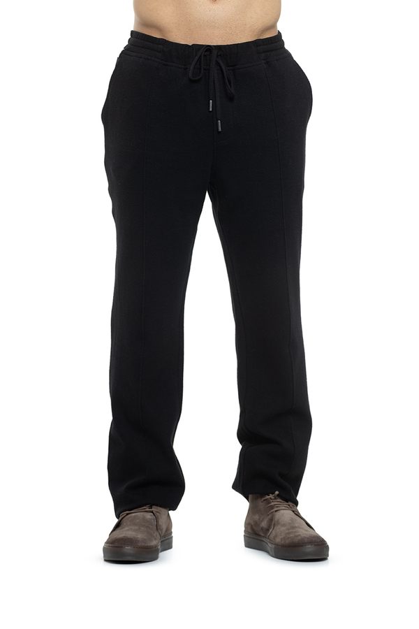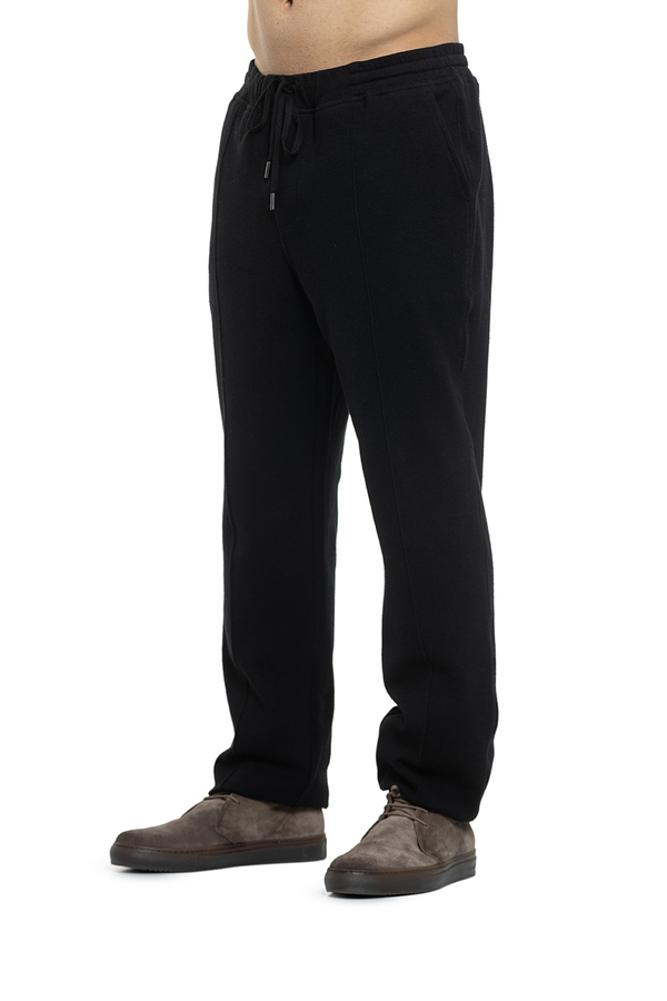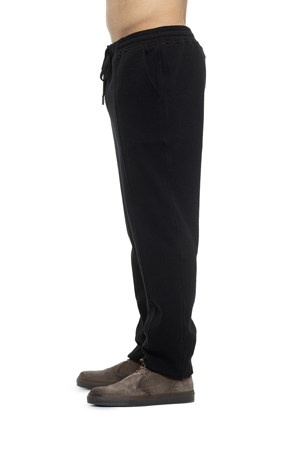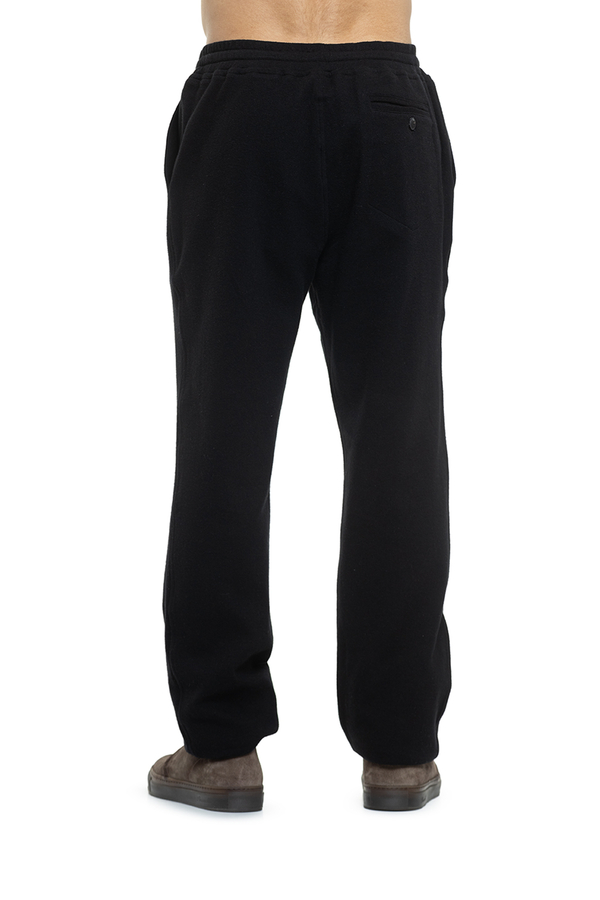 - Sweatpants with an elastic waistband with a drawstring, two slit pockets on the sides and one at the back