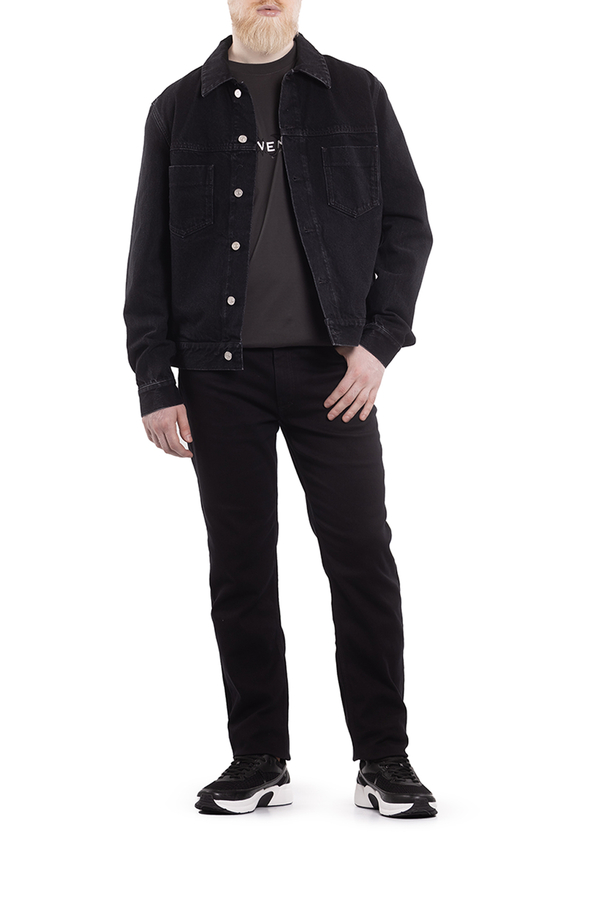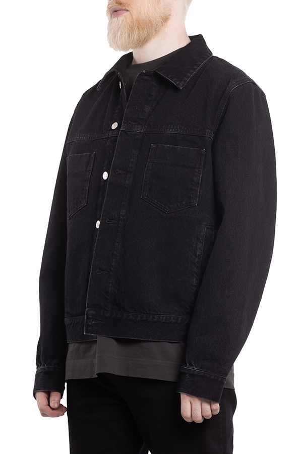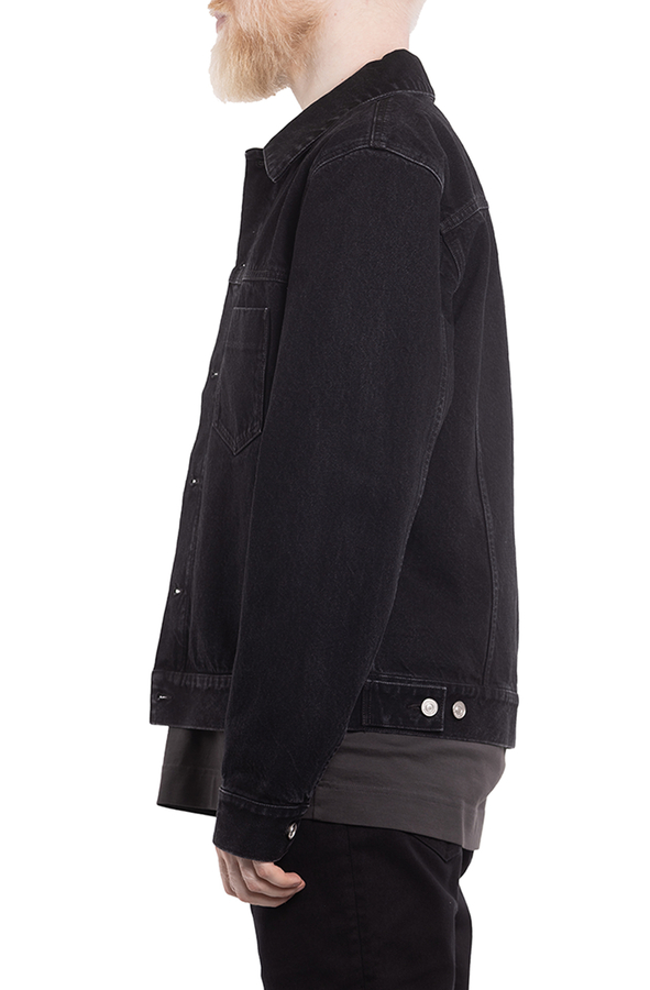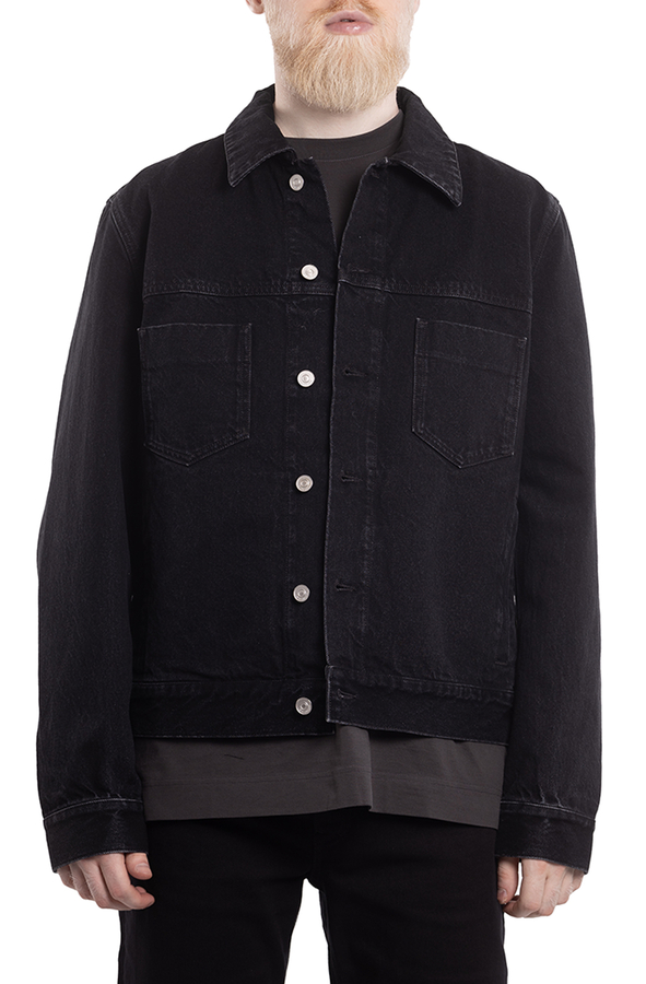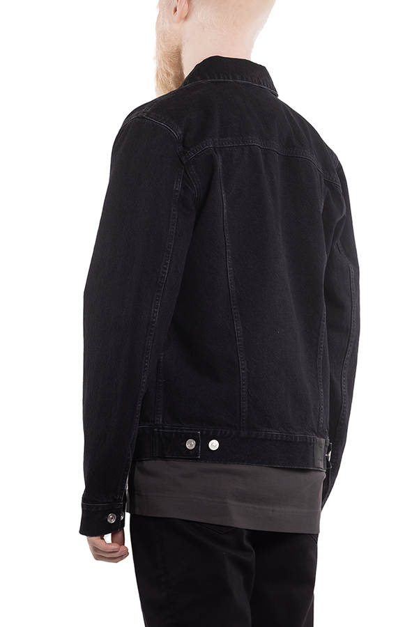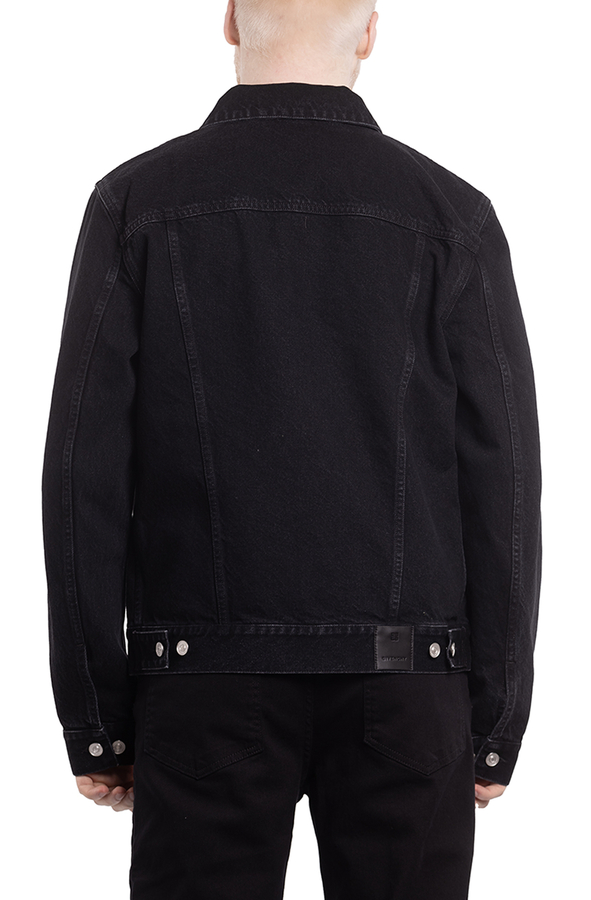 - Relaxed fit denim jacket with distressed seams, adjustable back fastenings and a leather insert with embossed logo.
