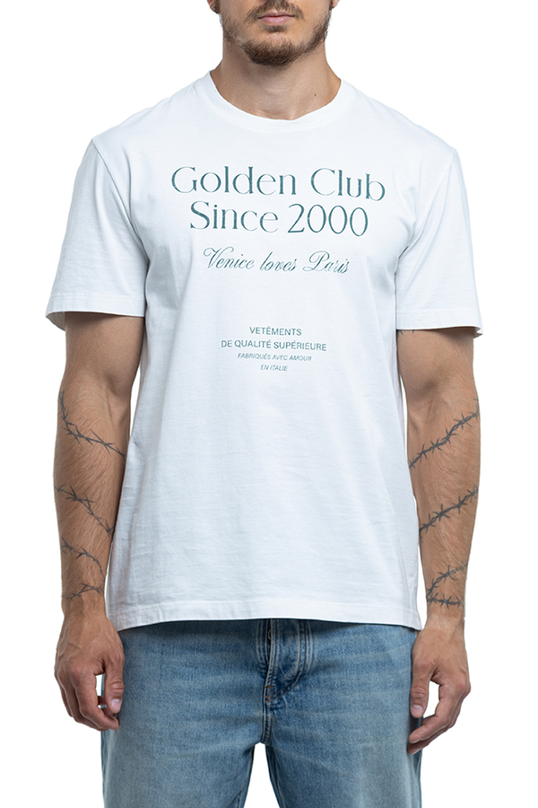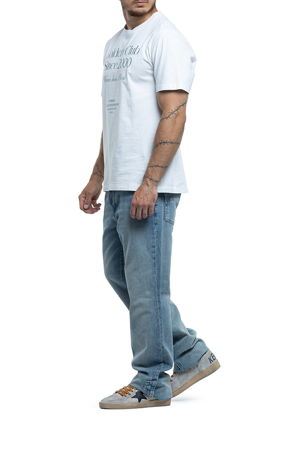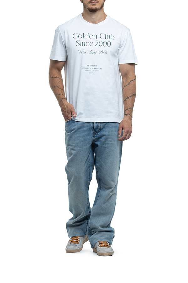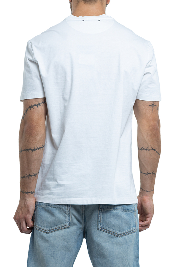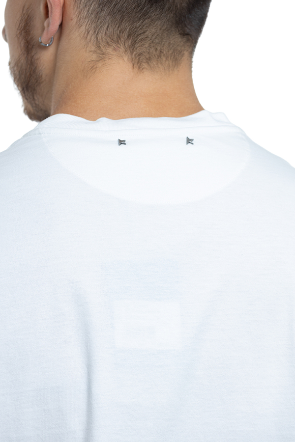 - Short sleeve t-shirt with a round neckline, contrasting logo lettering on the chest, and a double silver star on the back.