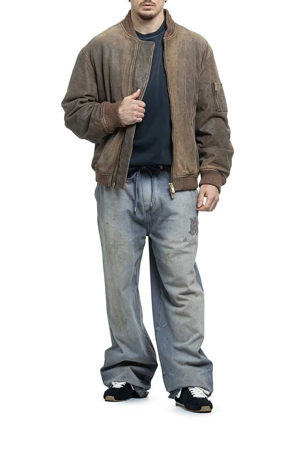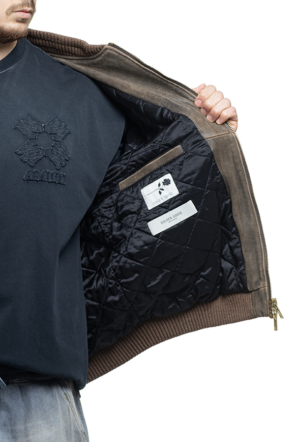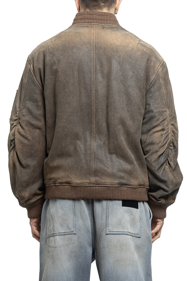 - Leather jacket with a worn effect, ribbed panels, one zipped pocket on the sleeve, two welt pockets with flaps and snap fastenings on the front, zip fastening