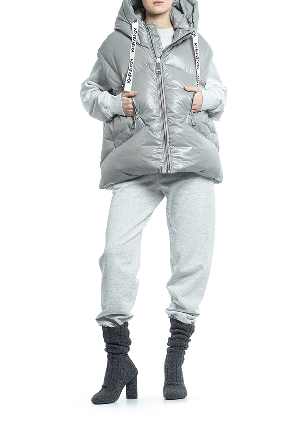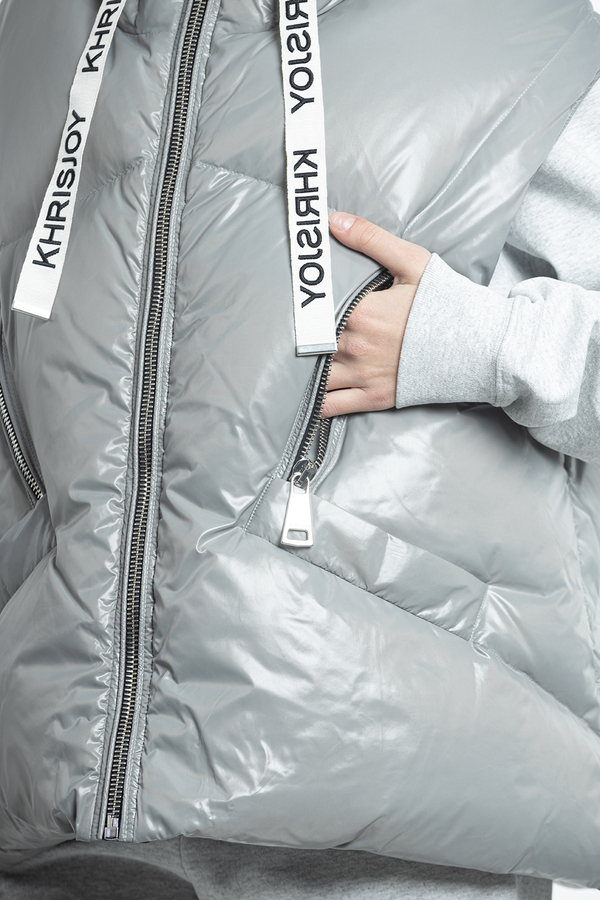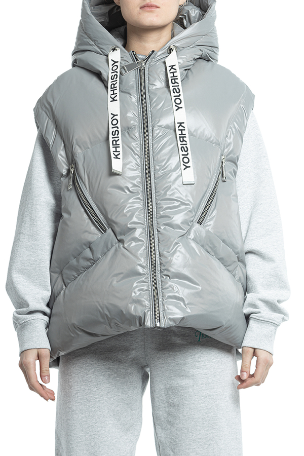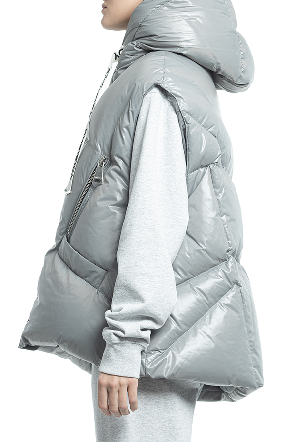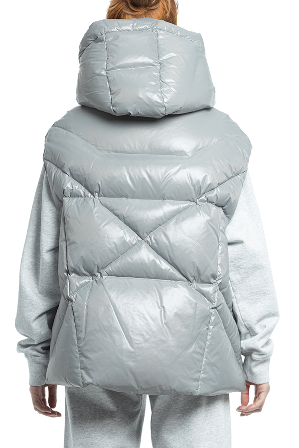 - Down vest, drawstring hood, front zip fastening, two side slit pockets and two zipped pockets