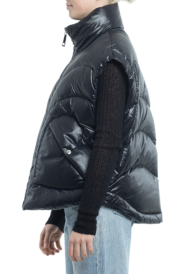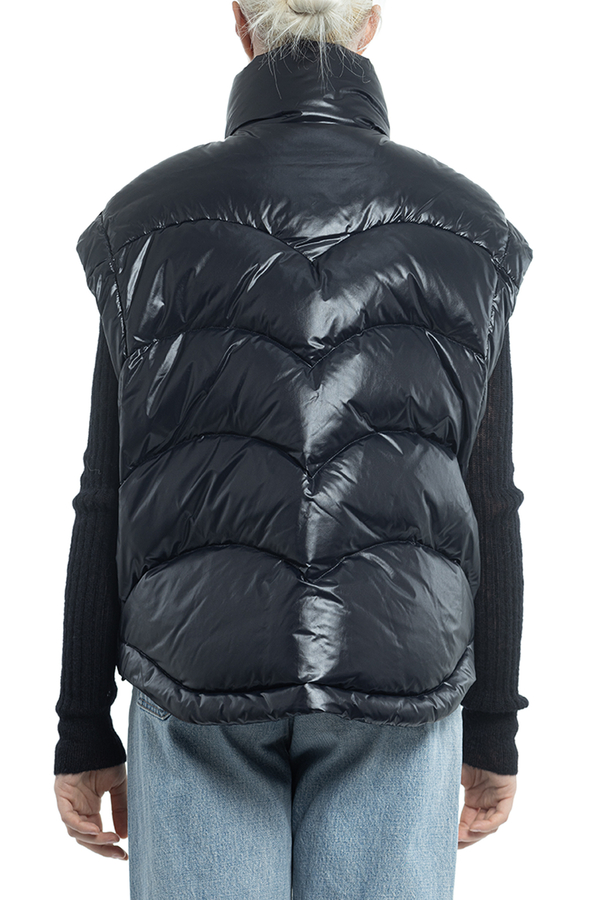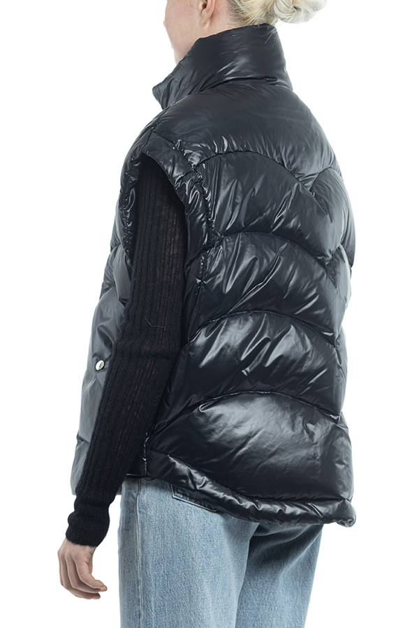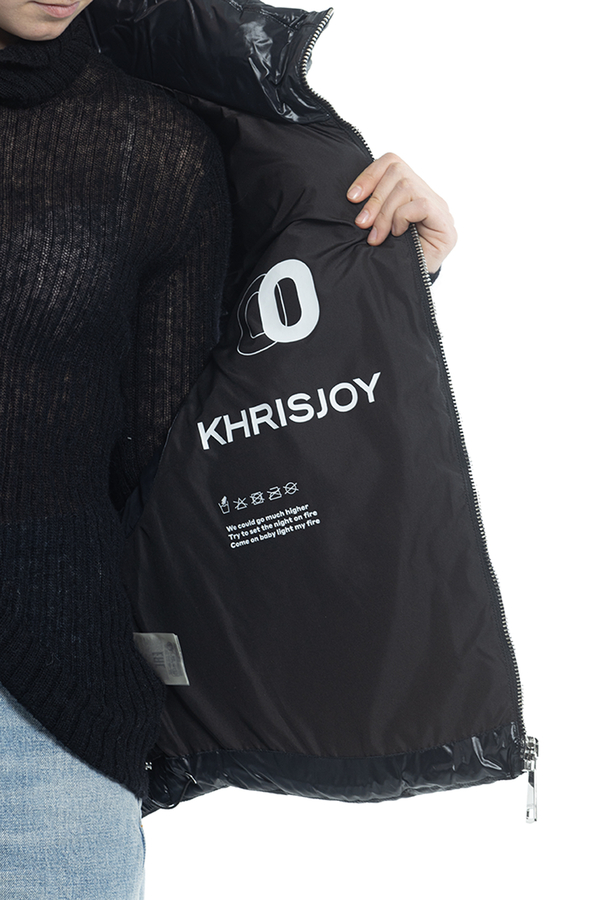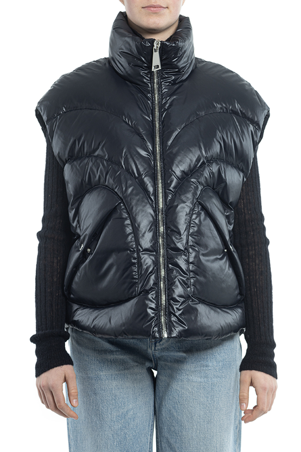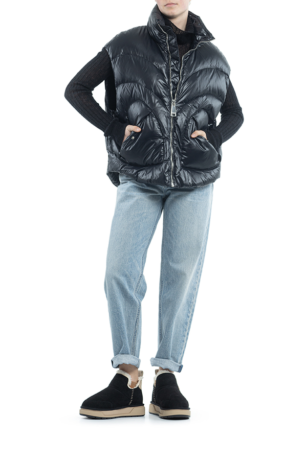 - Down jacket with a stand-up collar, zip fastening, internal adjustable drawstring at the bottom, slanted patch pockets with buttons
