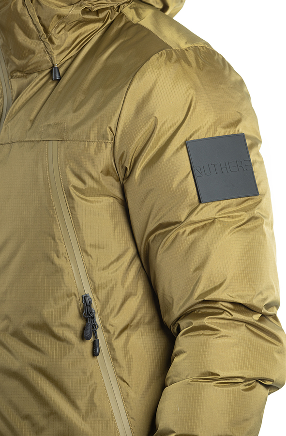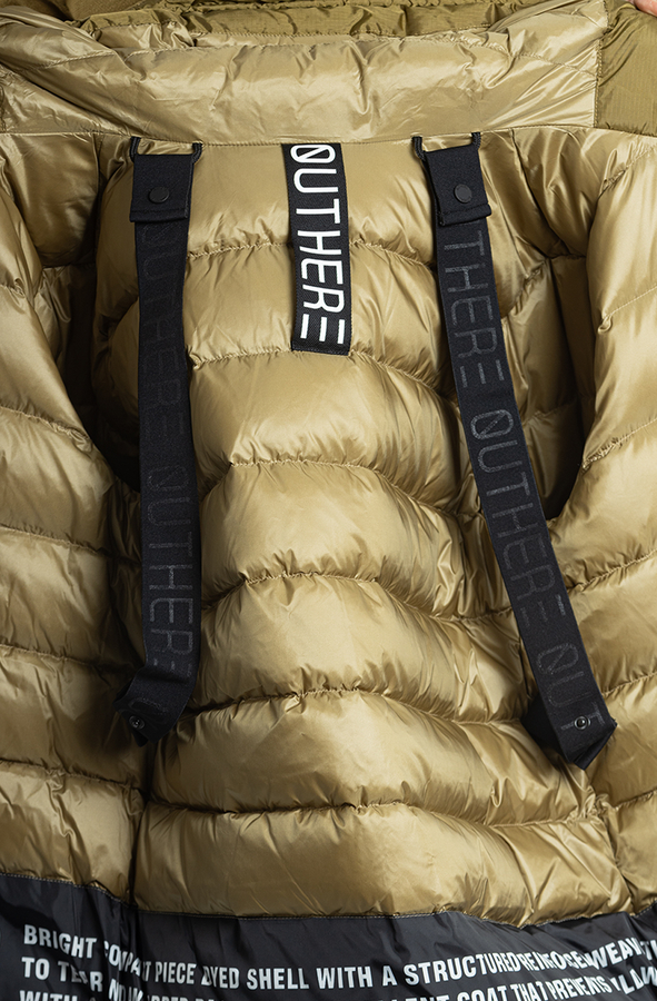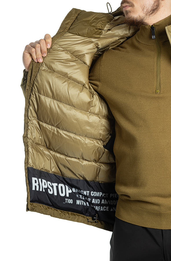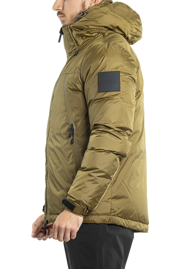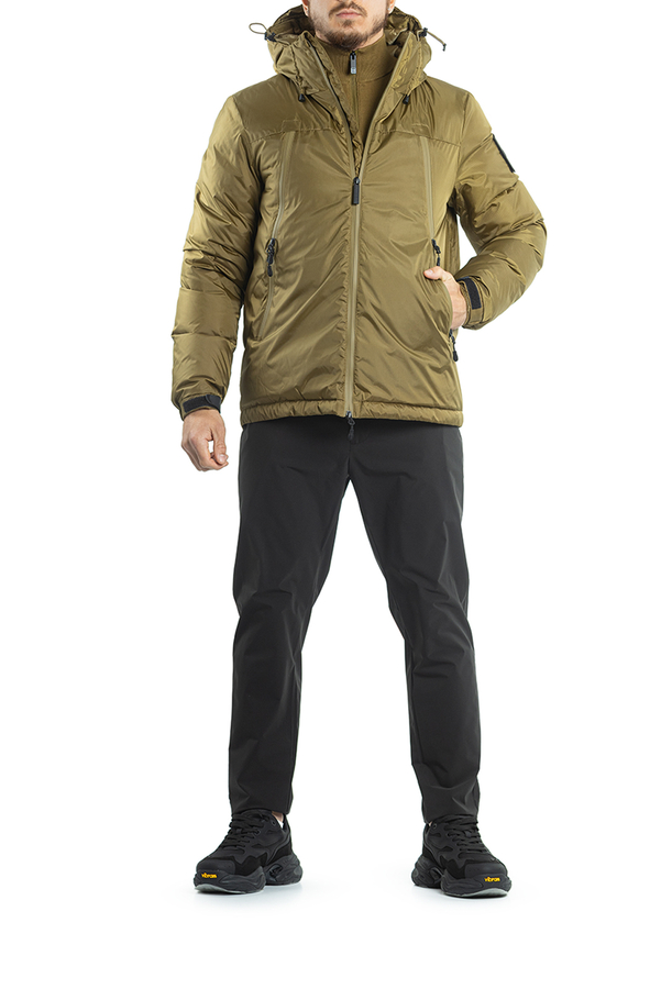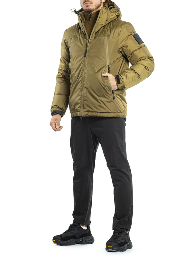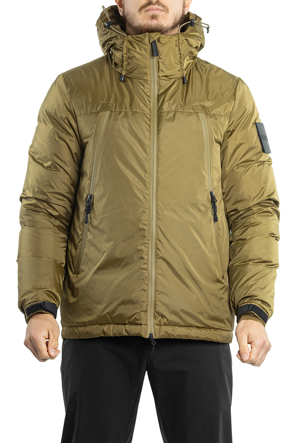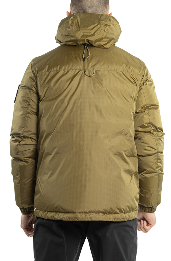 - Down jacket with a drawstring hood, adjustable cuffs, a front closure and two welt pockets with a zipper and a double slider.