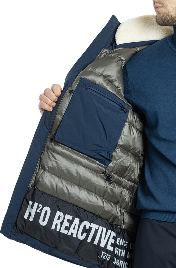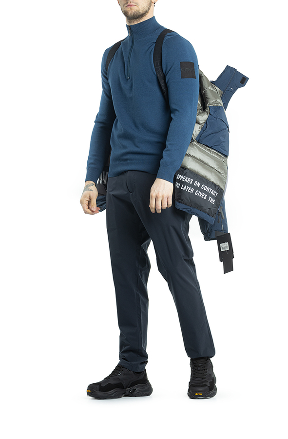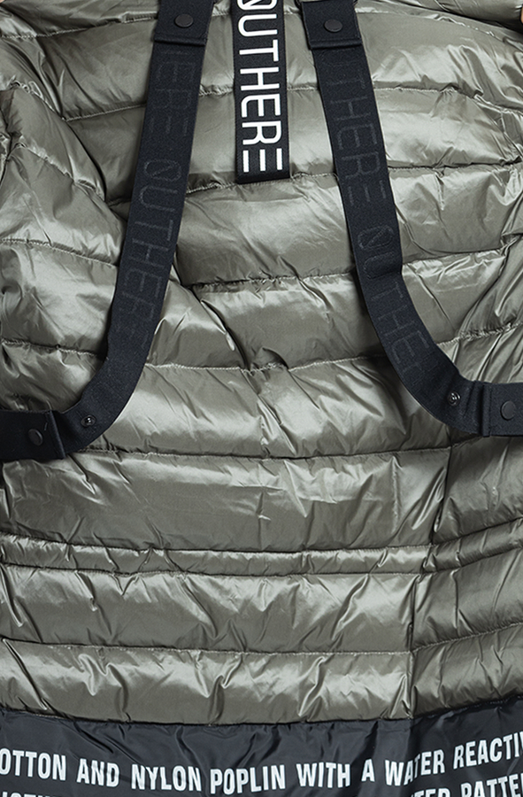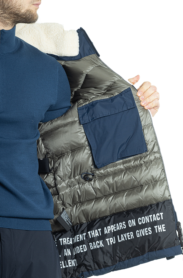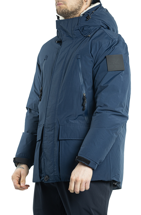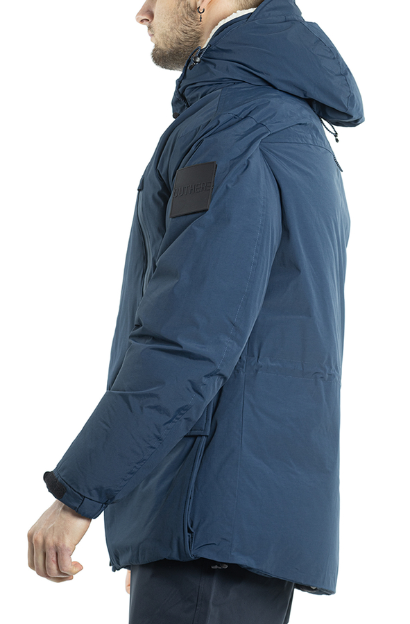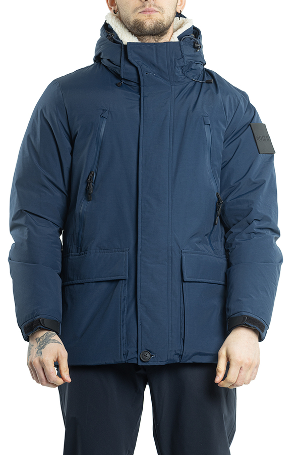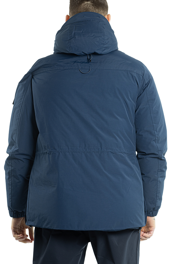 - Hooded down jacket with adjustable cuffs, two front patch pockets with flaps, two chest pockets with zippers with double sliders, two inner pockets, logo patch on the sleeve