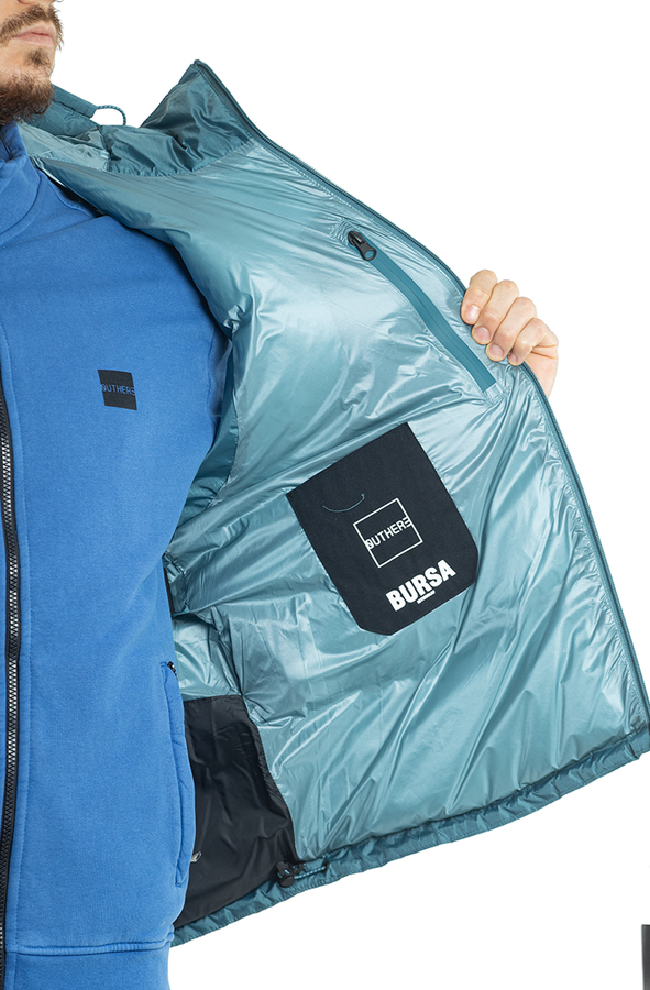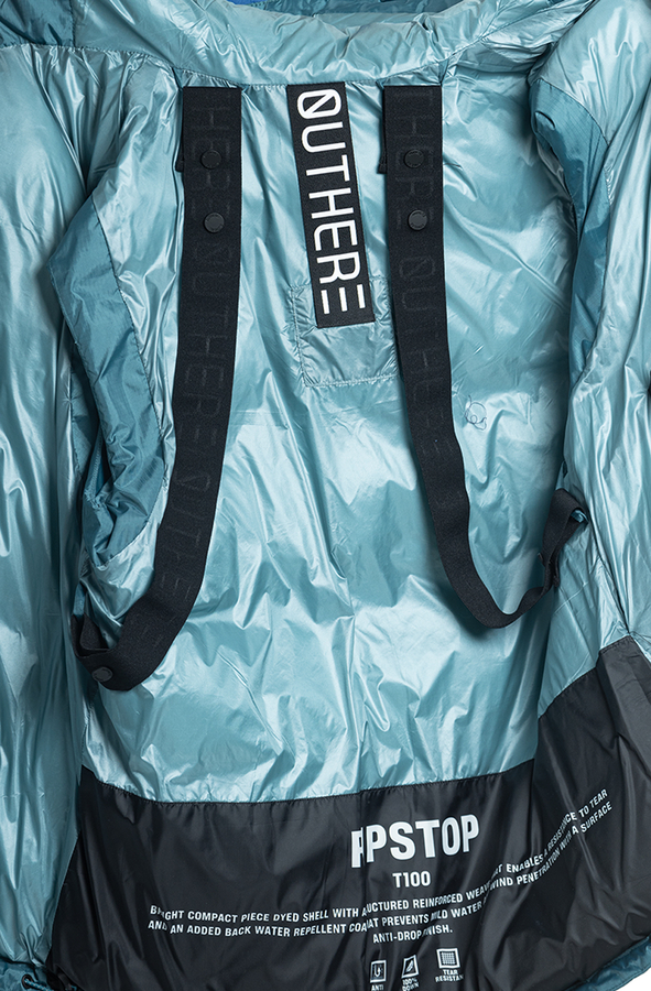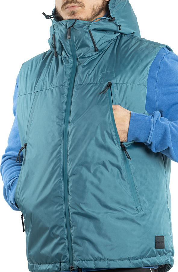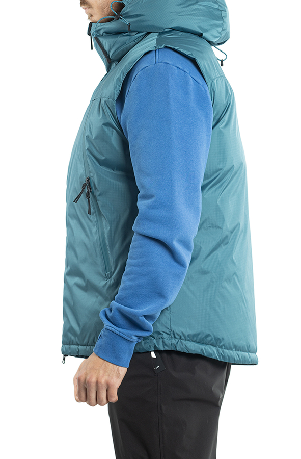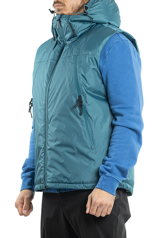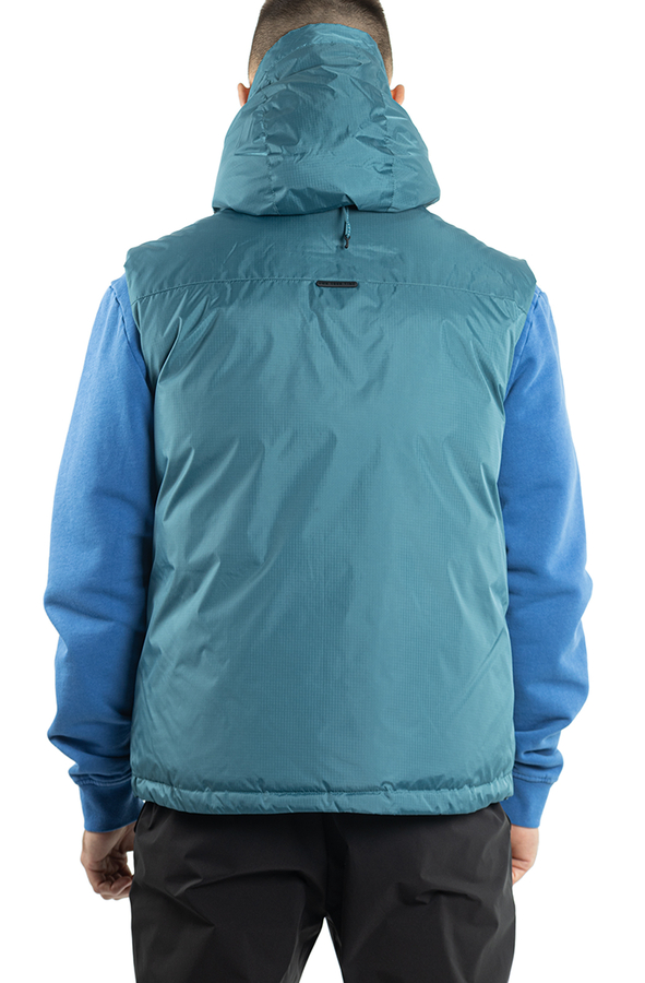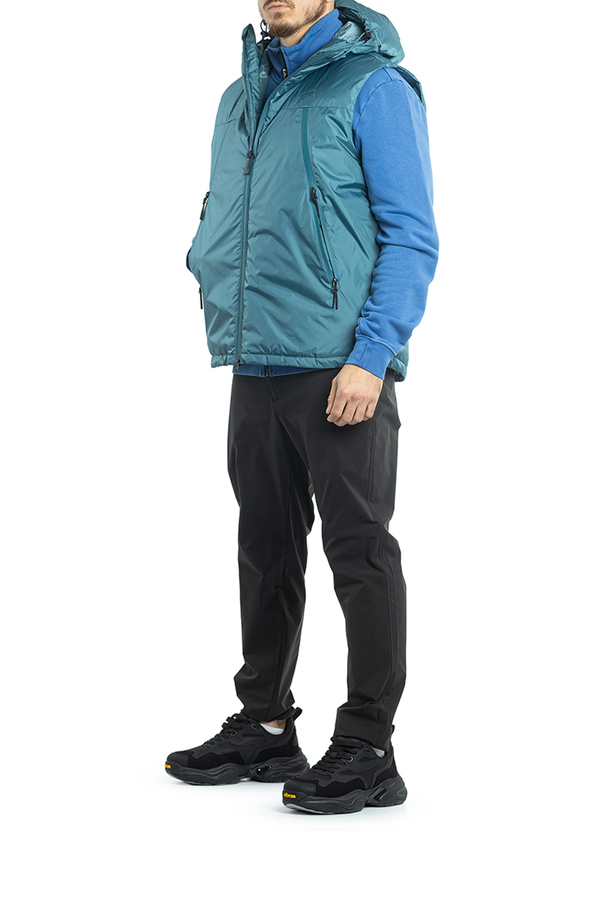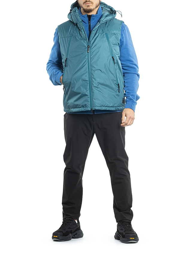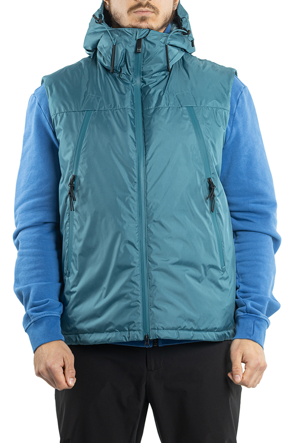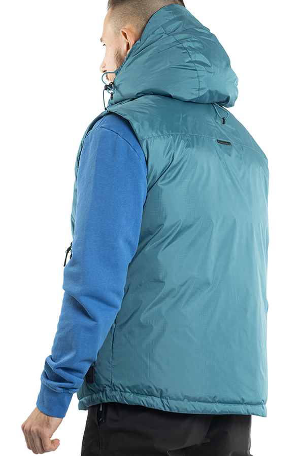 - Down vest with a drawstring hood, internal shoulder straps, two slit pockets with zippers at the front, one internal pocket with zippers, and a drawstring at the bottom
