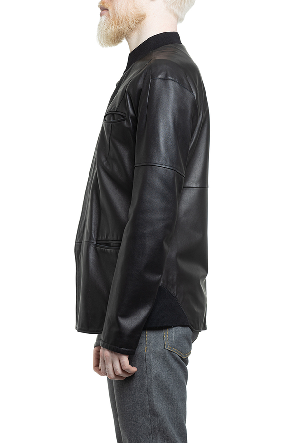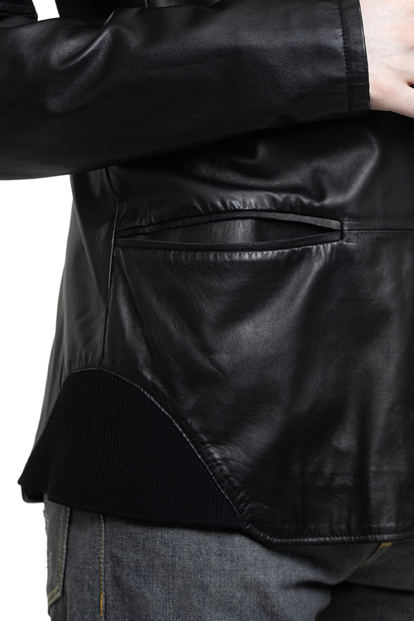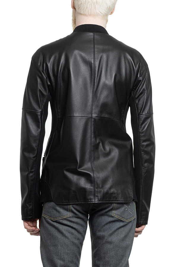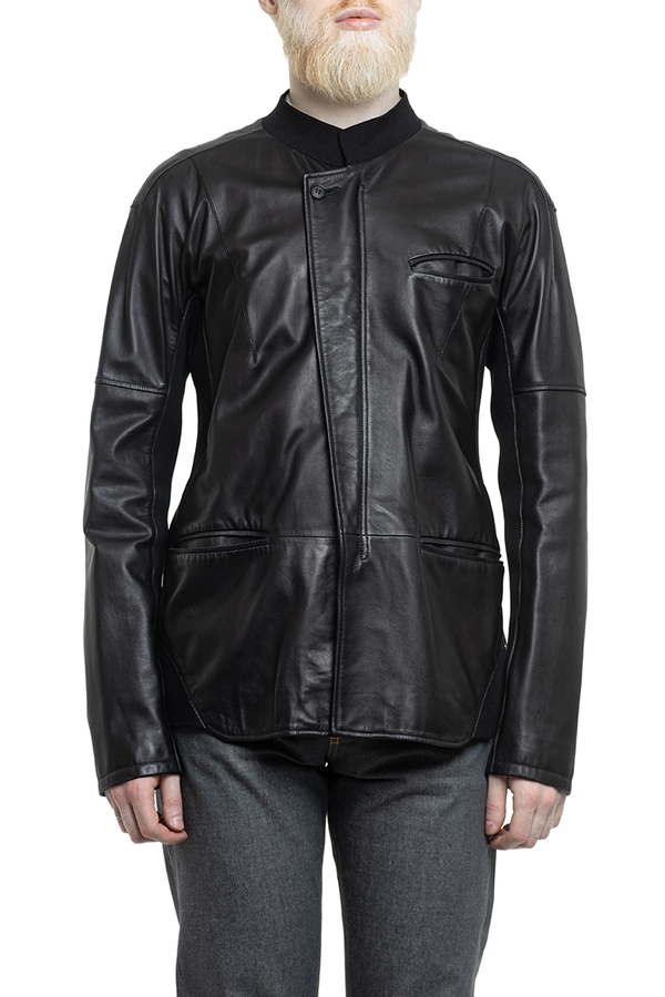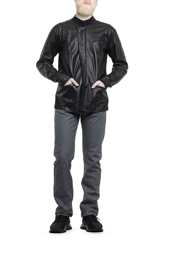 - Leather jacket with a ribbed collar, asymmetrical front, ribbed side panels, front patch pockets