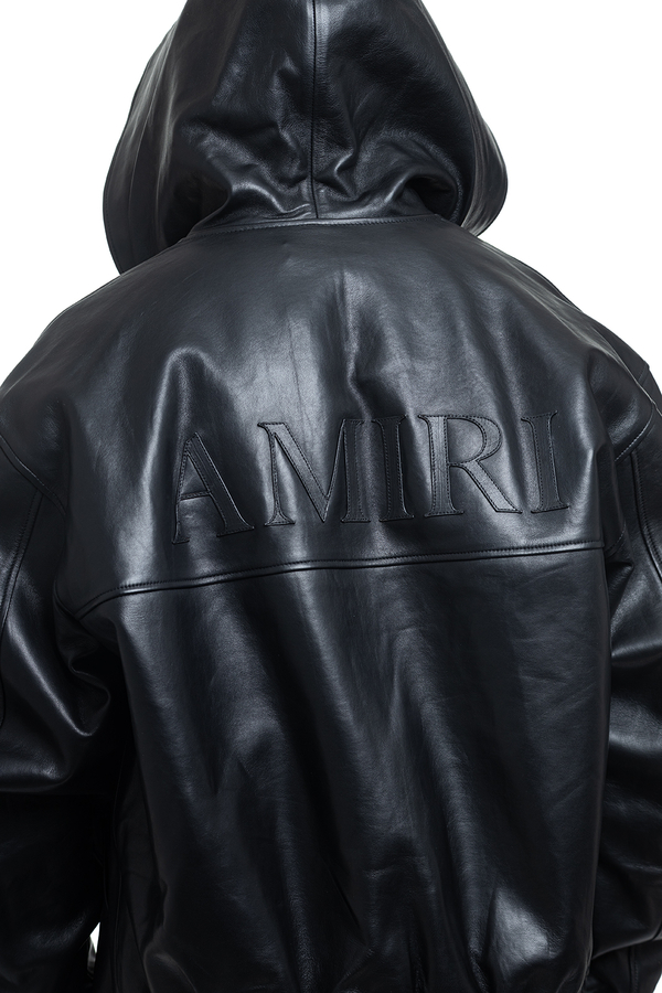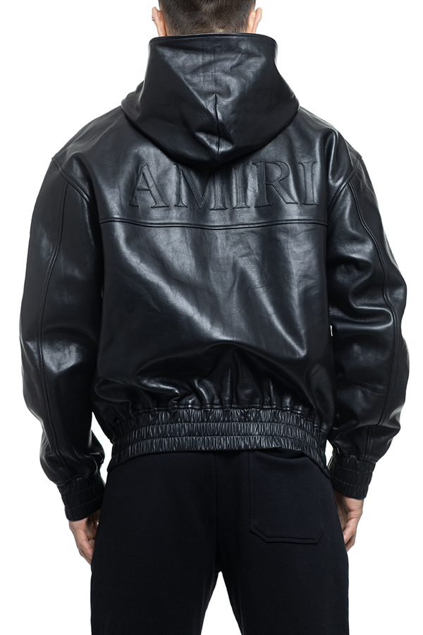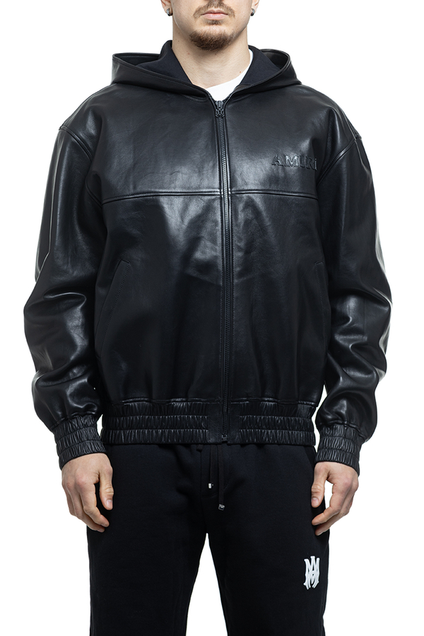 - Leather jacket with a hood, front zip fastening, ribbed hem and cuffs, two welt pockets on the sides, embossed logo on the chest