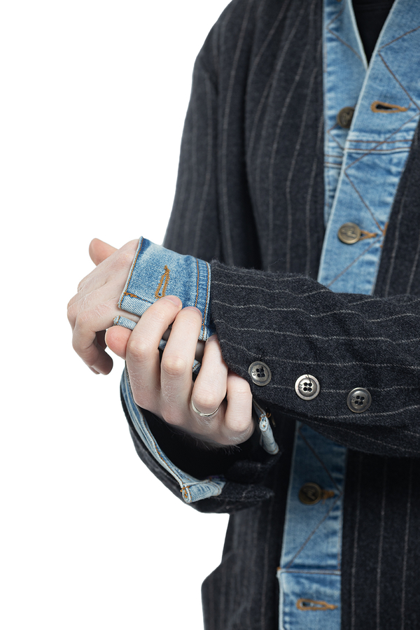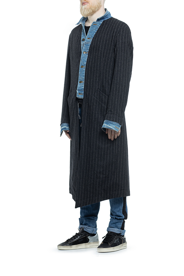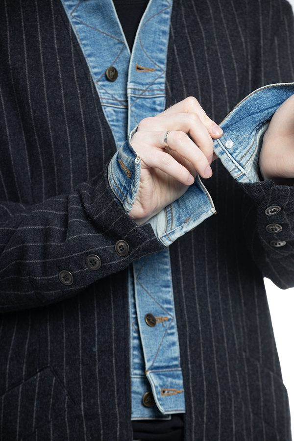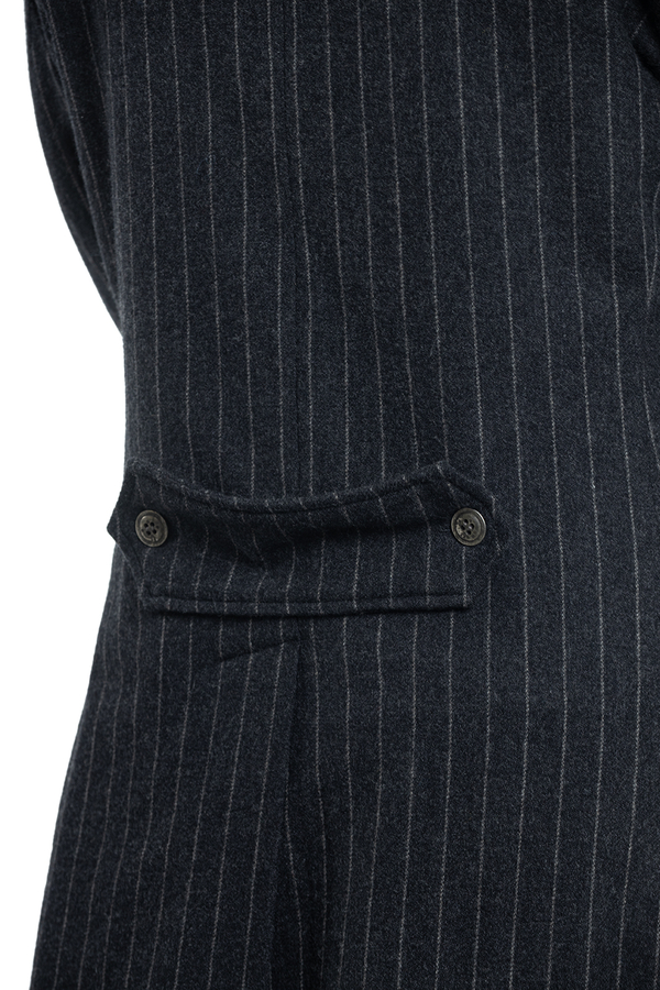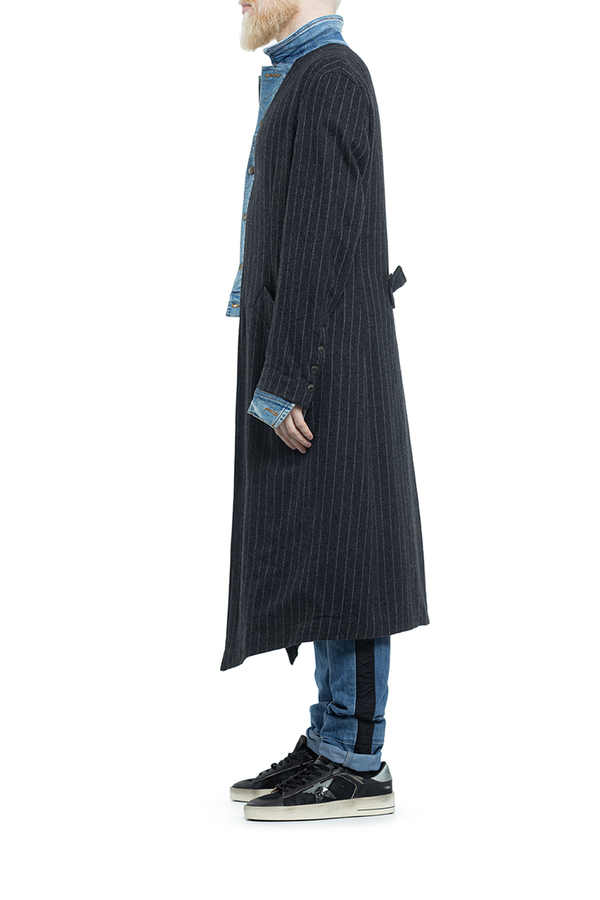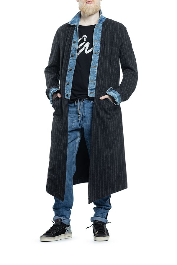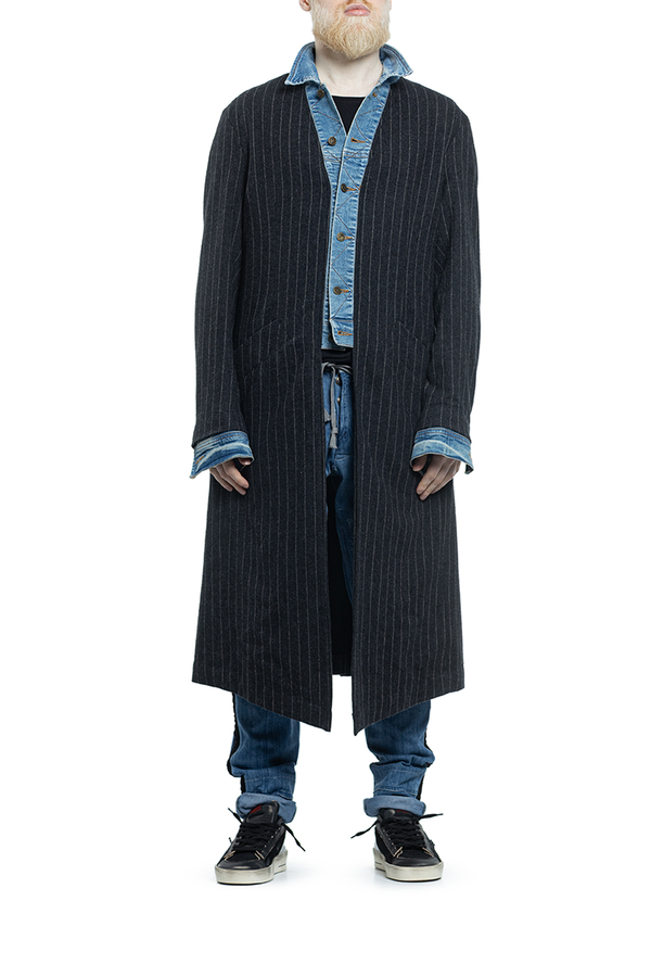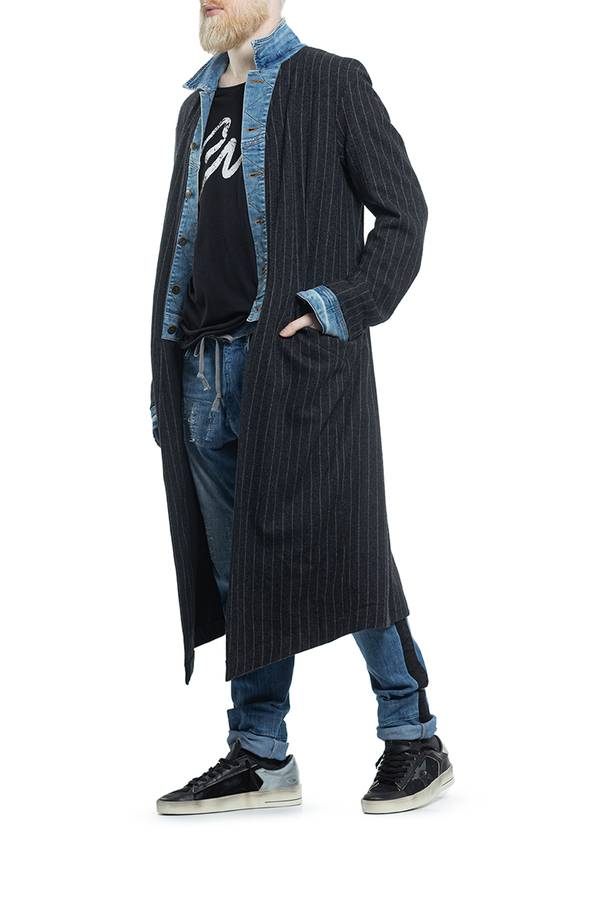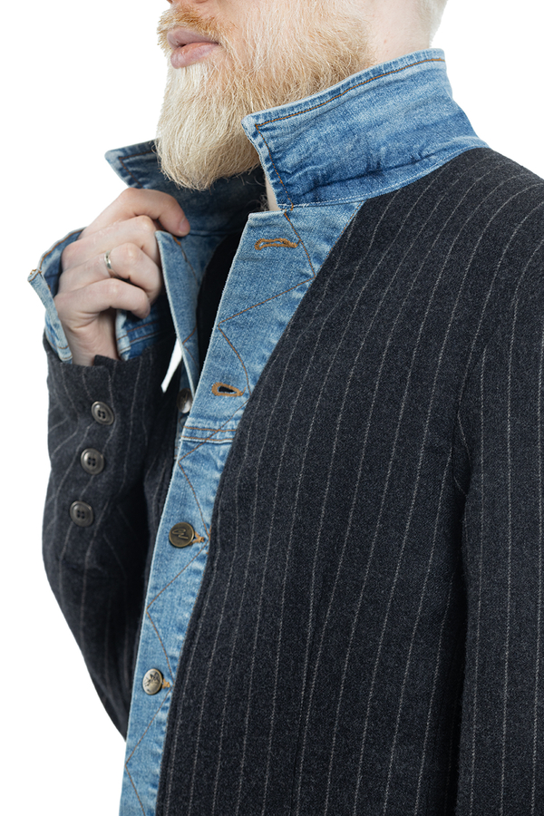 - Striped wool coat with denim inserts, classic collar, button fastening and cuffs, back vent