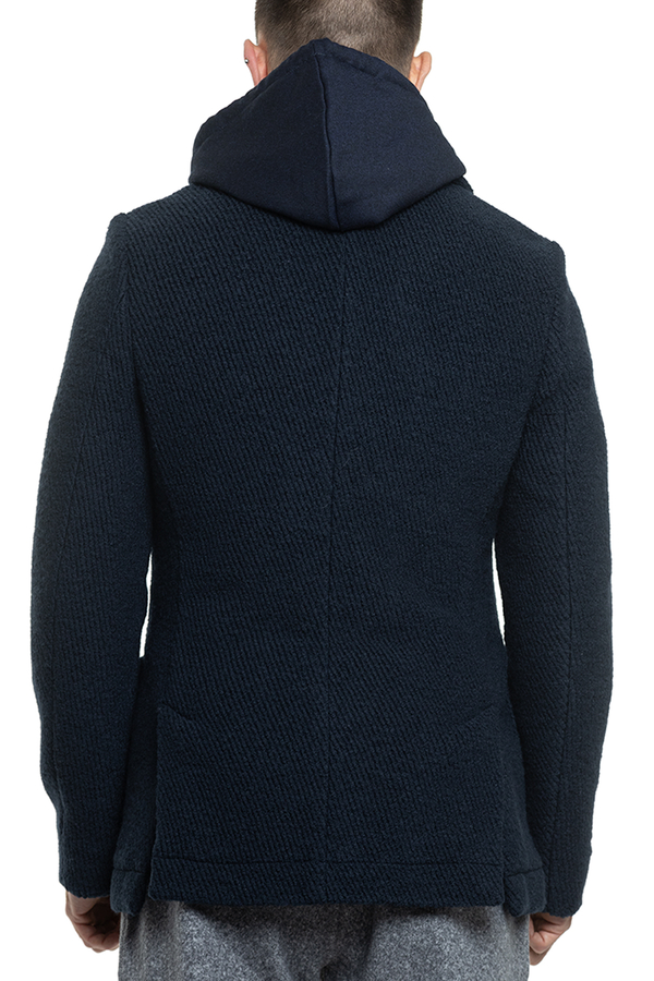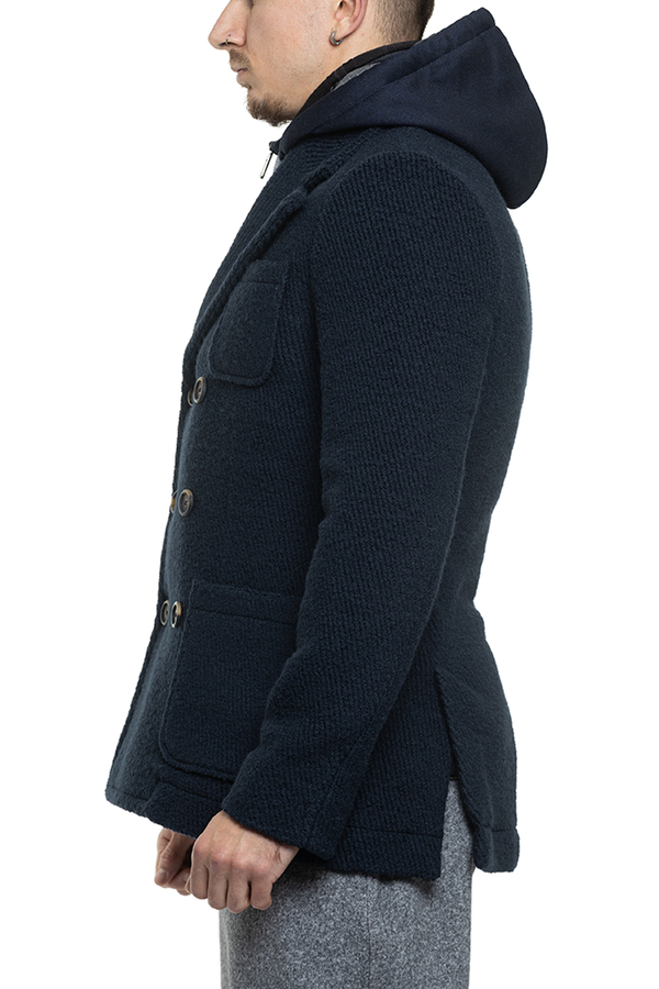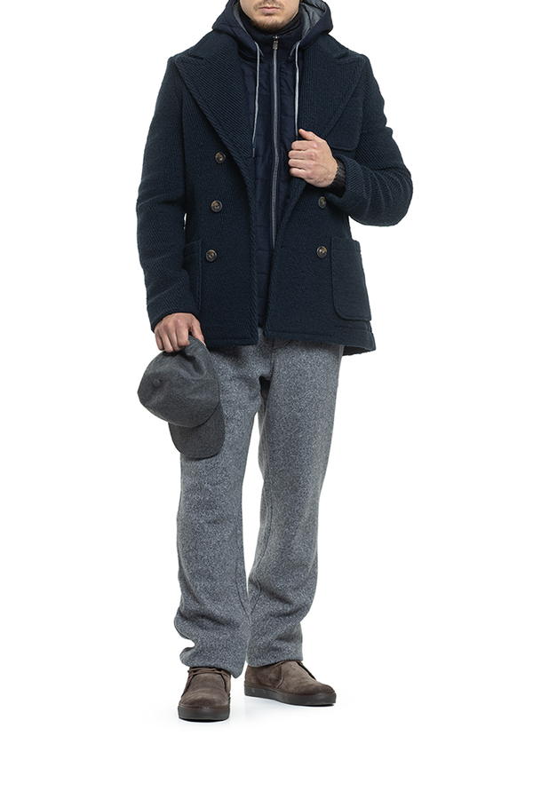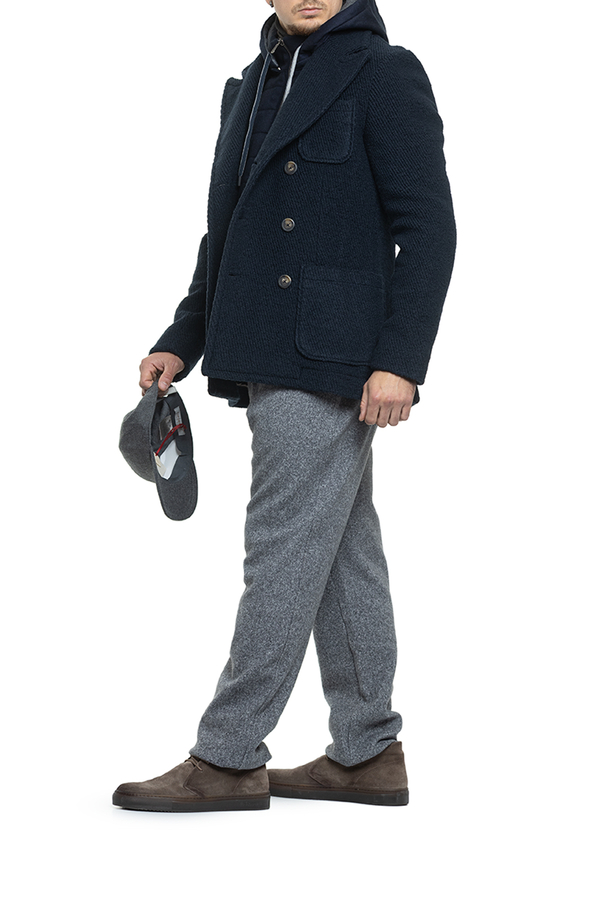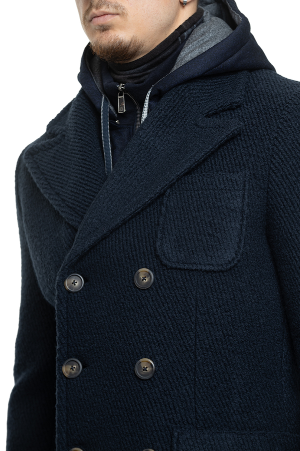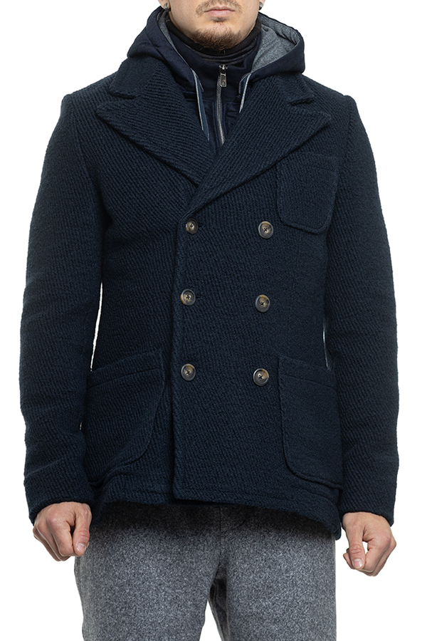 - Short double-breasted coat with peak lapels, button fastening, one chest patch pocket and two front patch pockets
