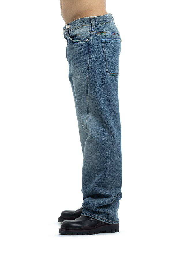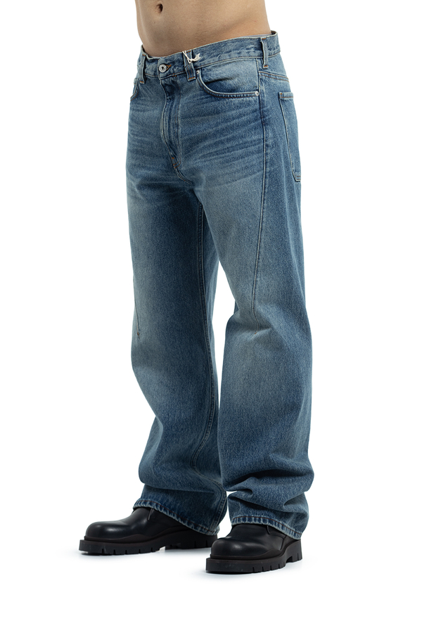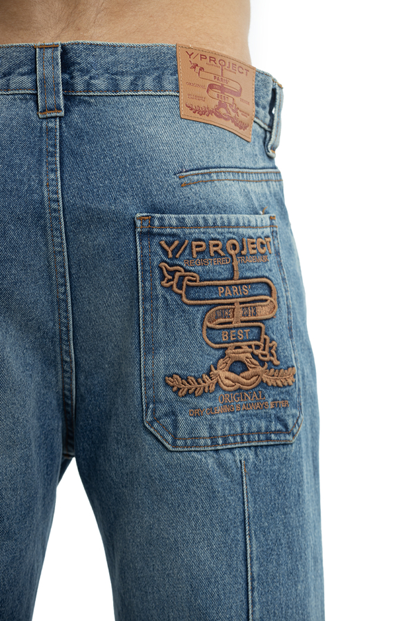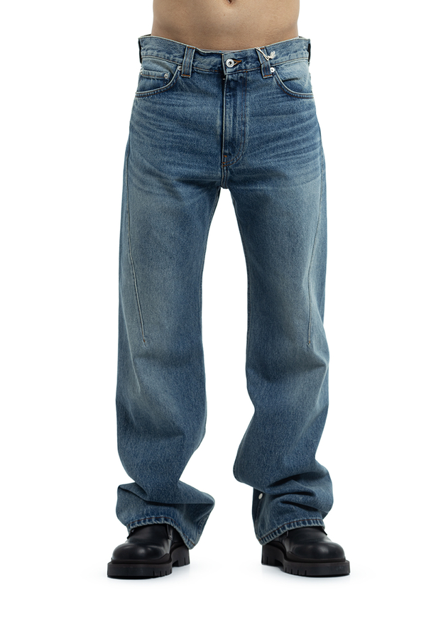 - Jeans with classic five pockets, belt loops, zip and button fastening, contrast appliqué and logo patch at the back