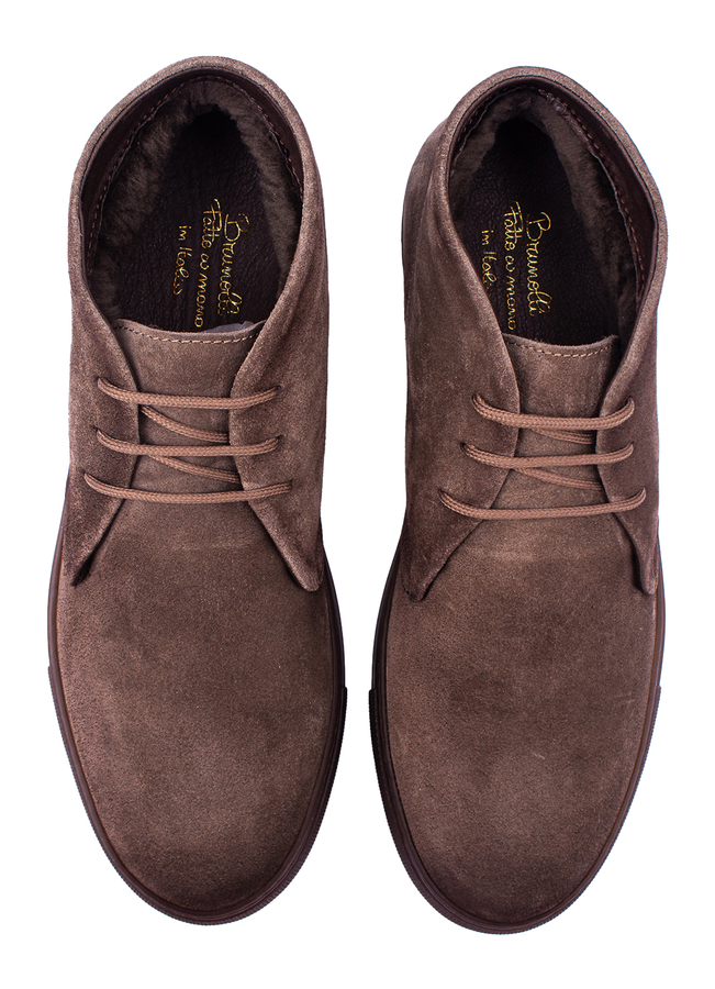 - Boots made of natural suede. Closure with laces, fur inside. Smooth outsole.