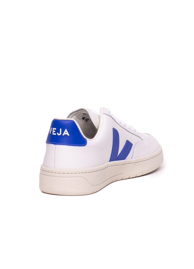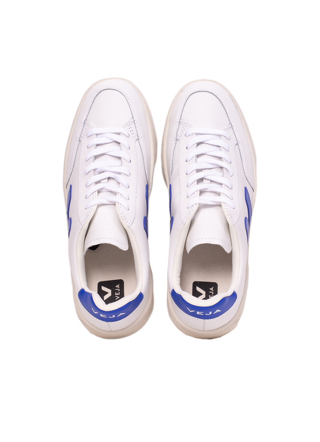 - Leather sneakers, lace-up front, V logo on the sides, blue insert with the brand name on the back.