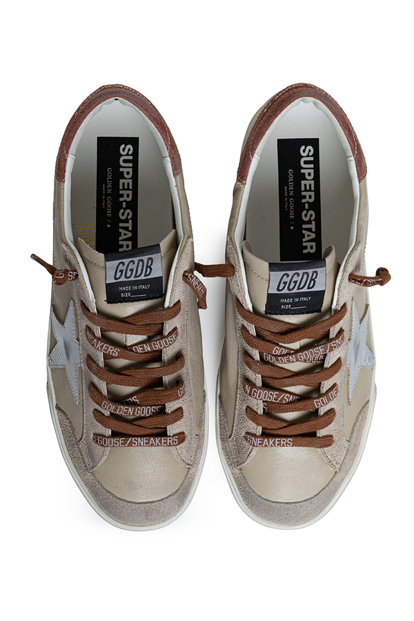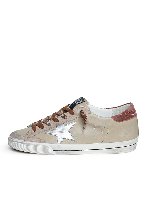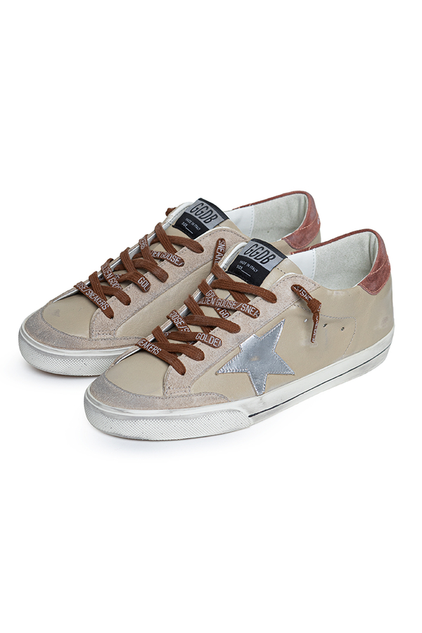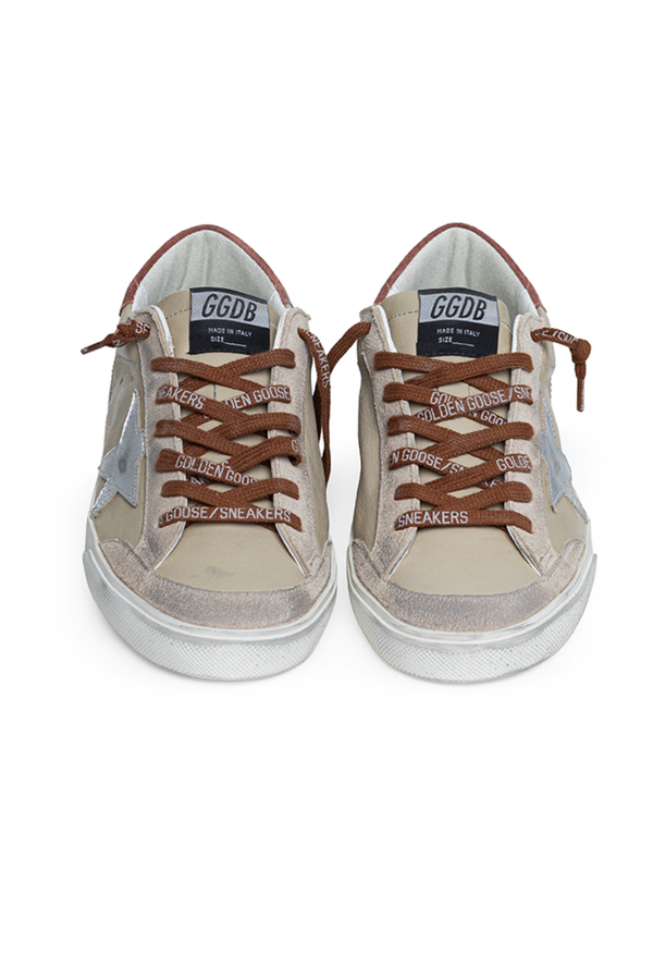 - These round toe sneakers feature a distressed finish, contrast laces with a logo, a signature star on the side, a logo patch on the tongue, and a printed logo on a contrast panel on the back.
