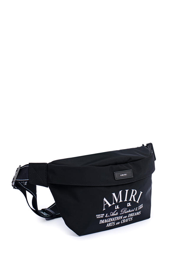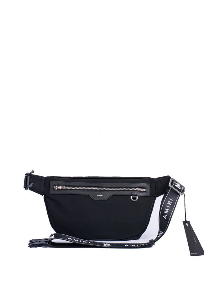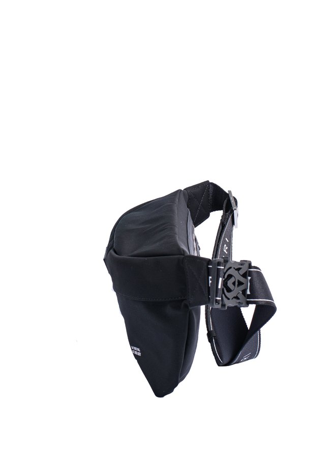 - Waist bag featuring an adjustable logo waist strap, a main compartment, a front zip closure, a zipped pocket, a printed logo and text on the front, an embossed logo on the back, and silver-tone hardware.