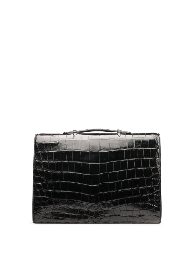 - Crocodile leather briefcase. Glossy surface. One upper handle.