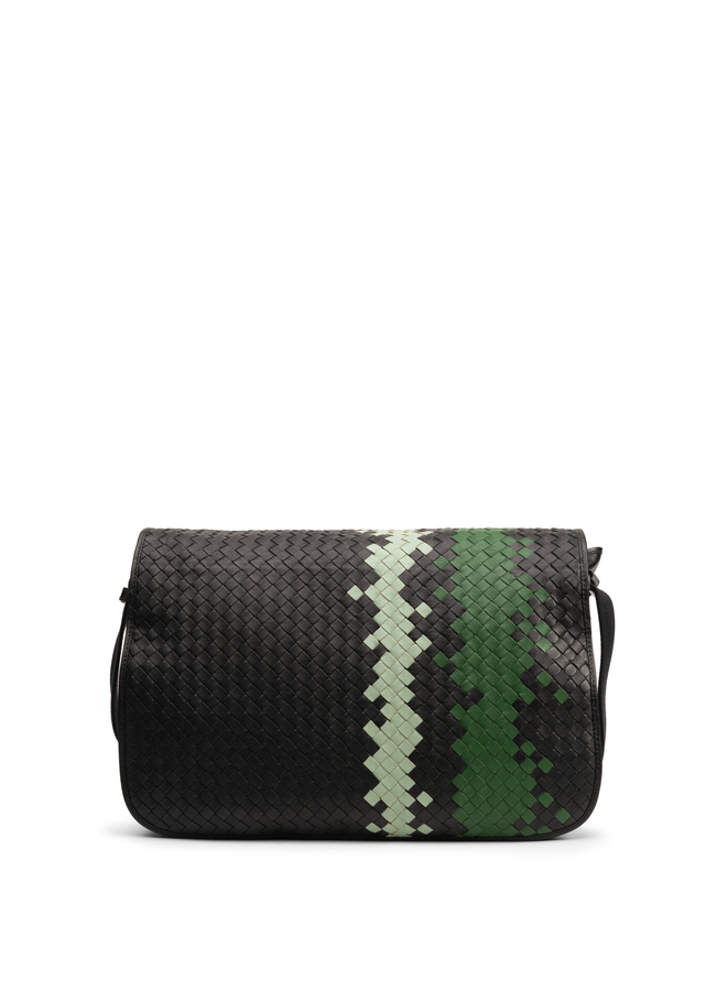 - Large bag with textile belt. Featuring flap, branded weaving Intrecciato with another color leather decoration. Textile lining.