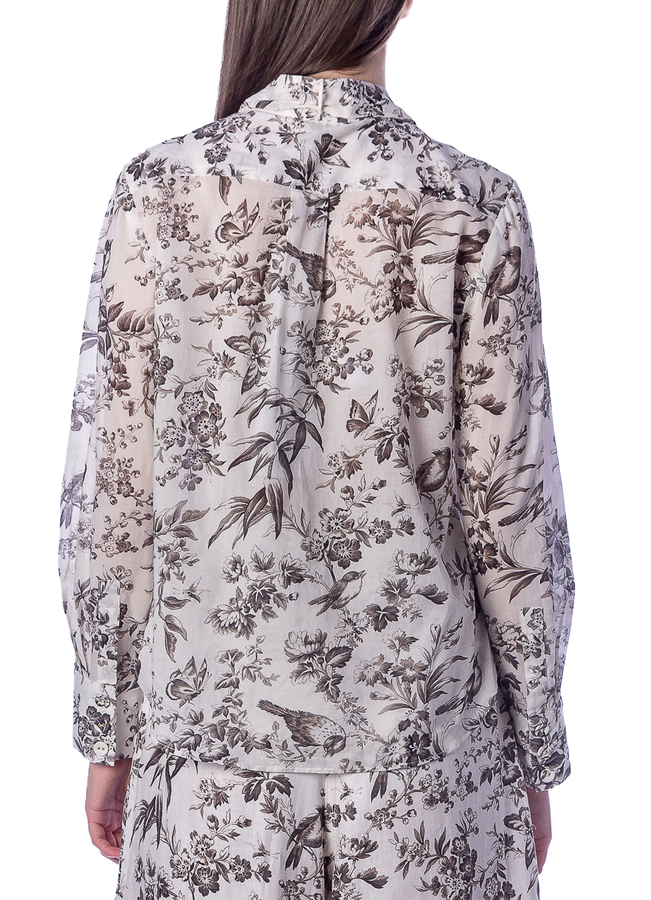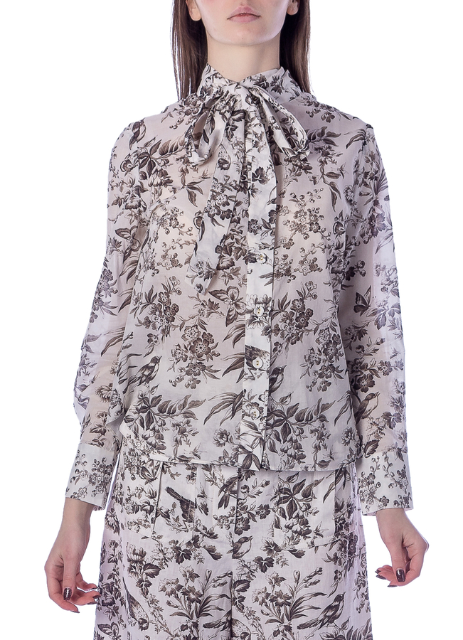 - Shirt with a floral print. Full floral print, ribbon collar, bow detailing, front button fastening, long sleeves, curved hem.