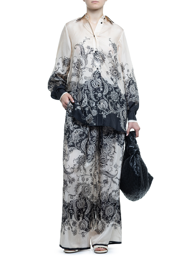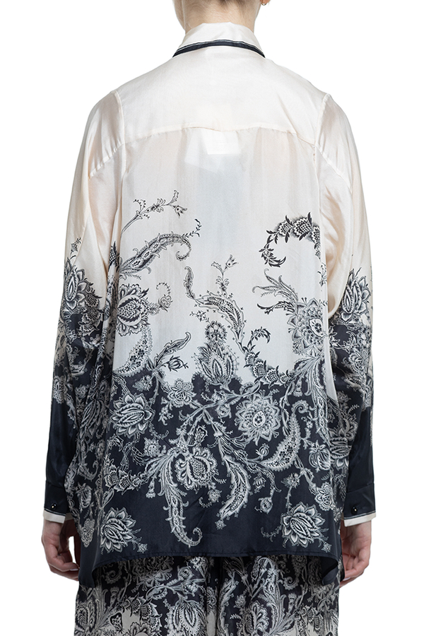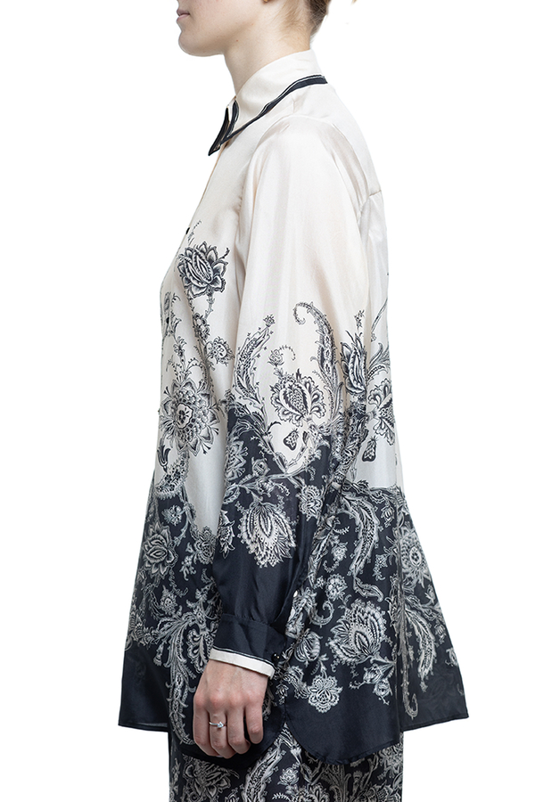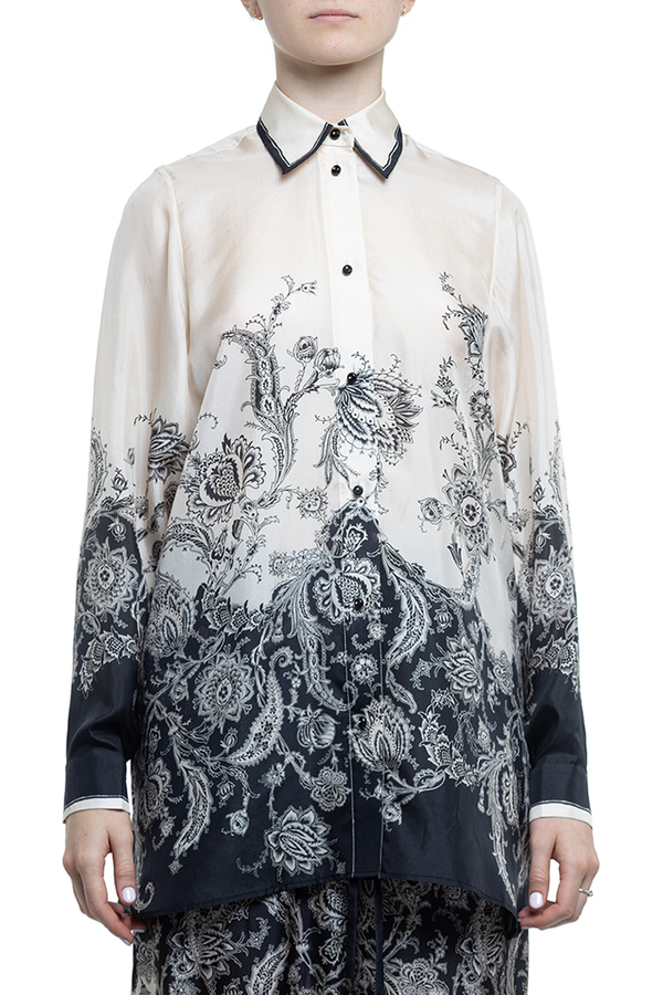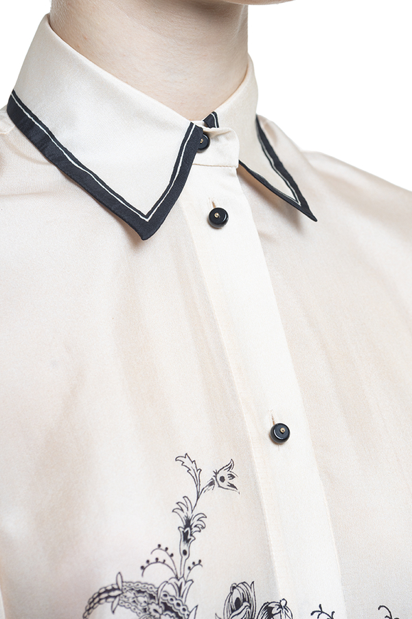 - Long-sleeved shirt, loose fit, classic collar with contrast hem, floral print, front button fastening