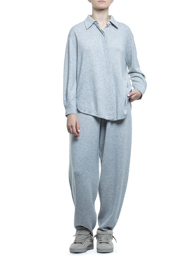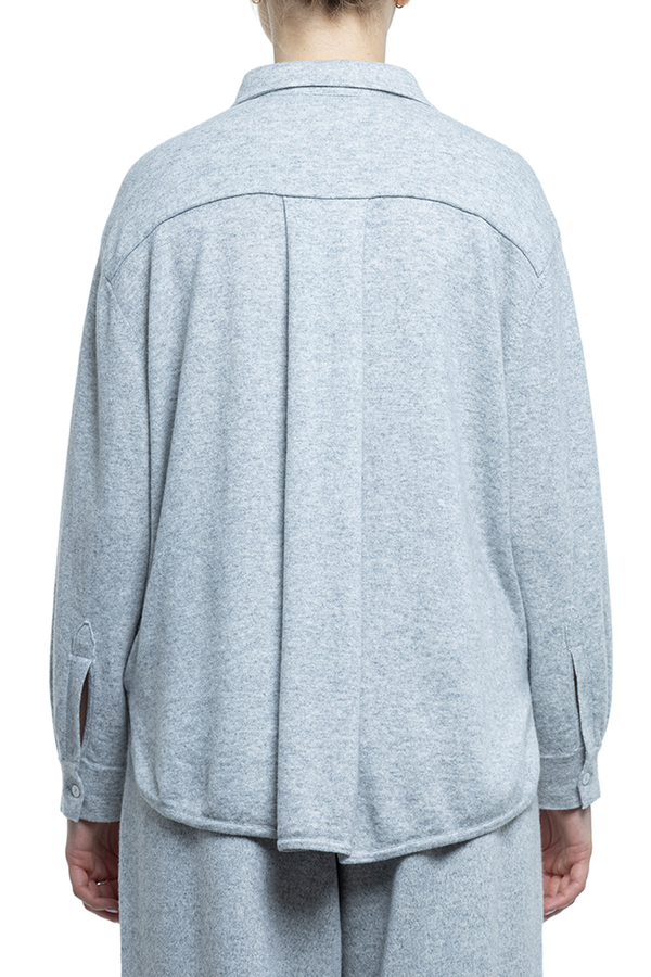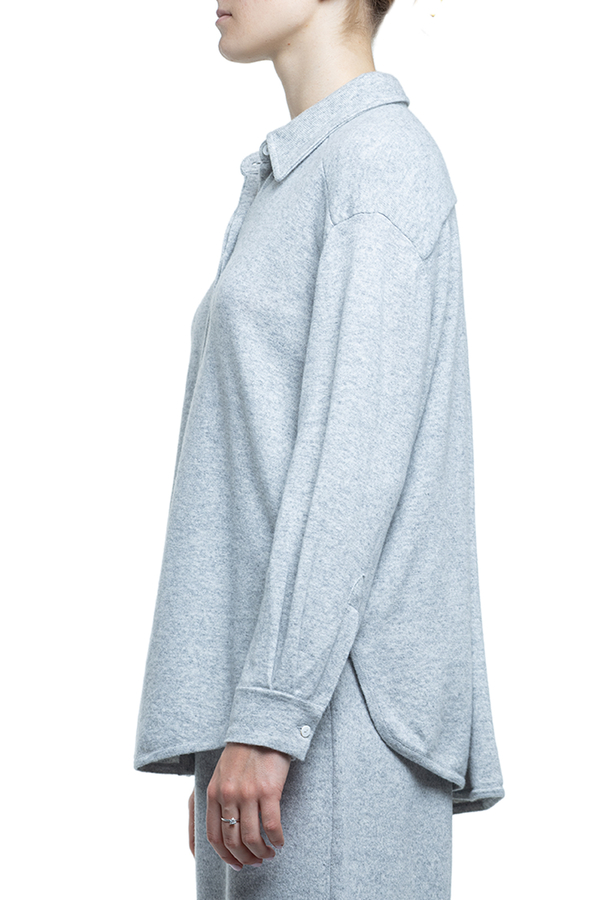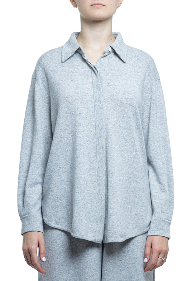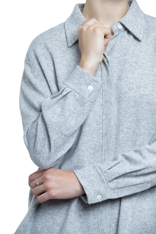 - A loose-fitting shirt with long sleeves, a classic collar, dropped shoulders, a concealed button fastening, and a rounded hem.