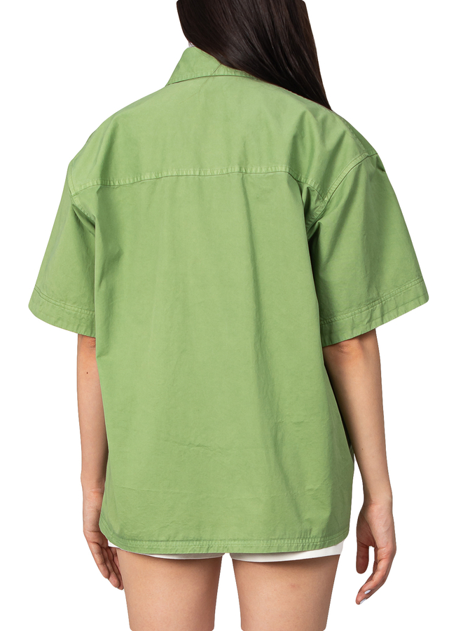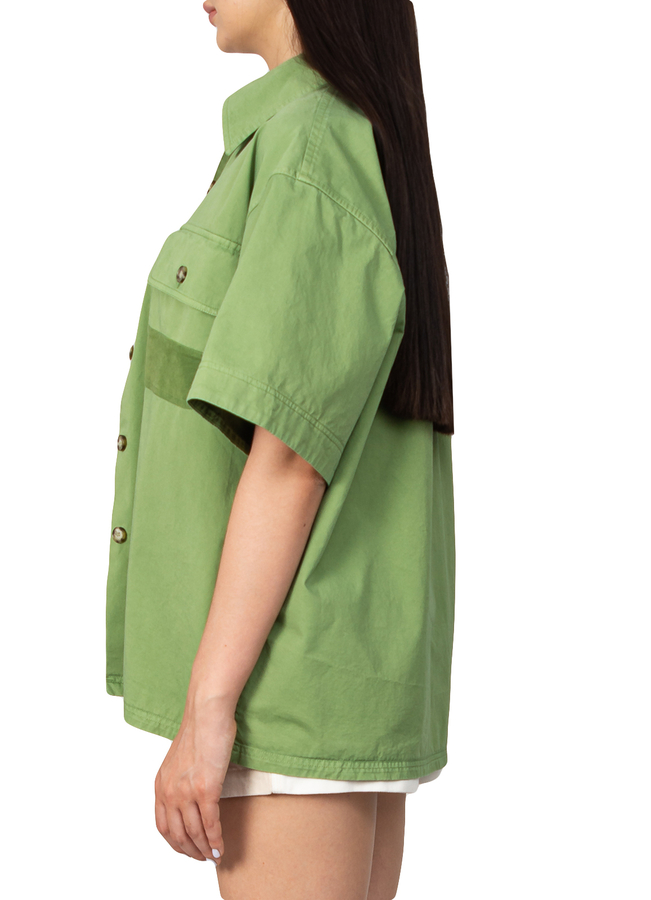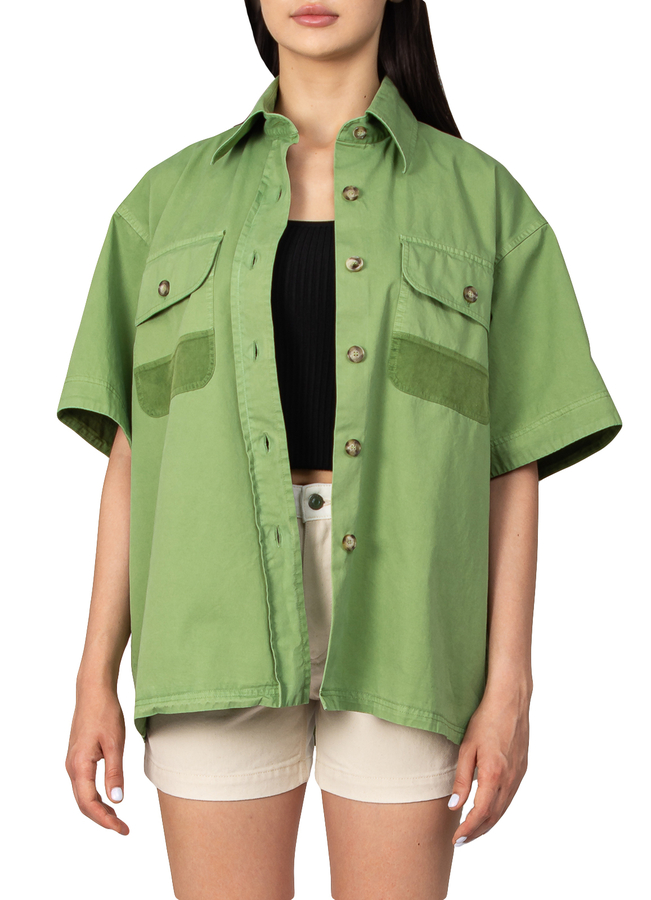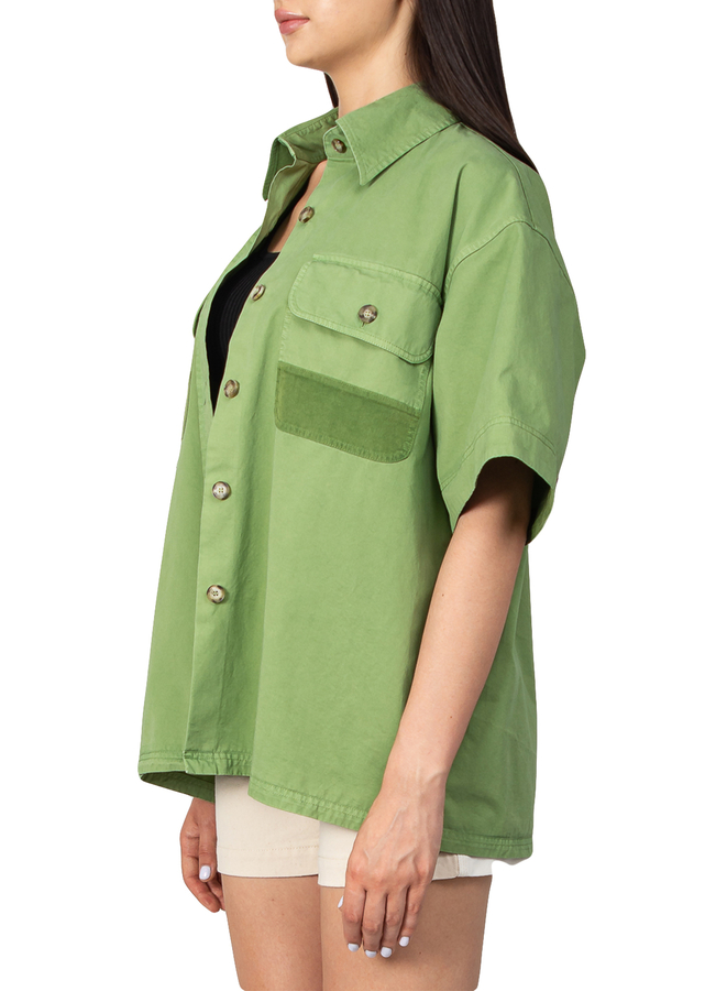 - Short sleeve shirt, classic collar, dropped shoulders, front button closure, two front flap pockets