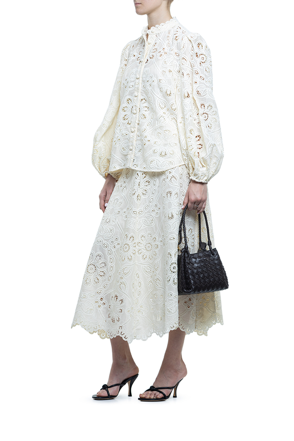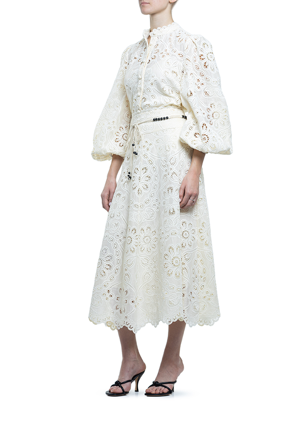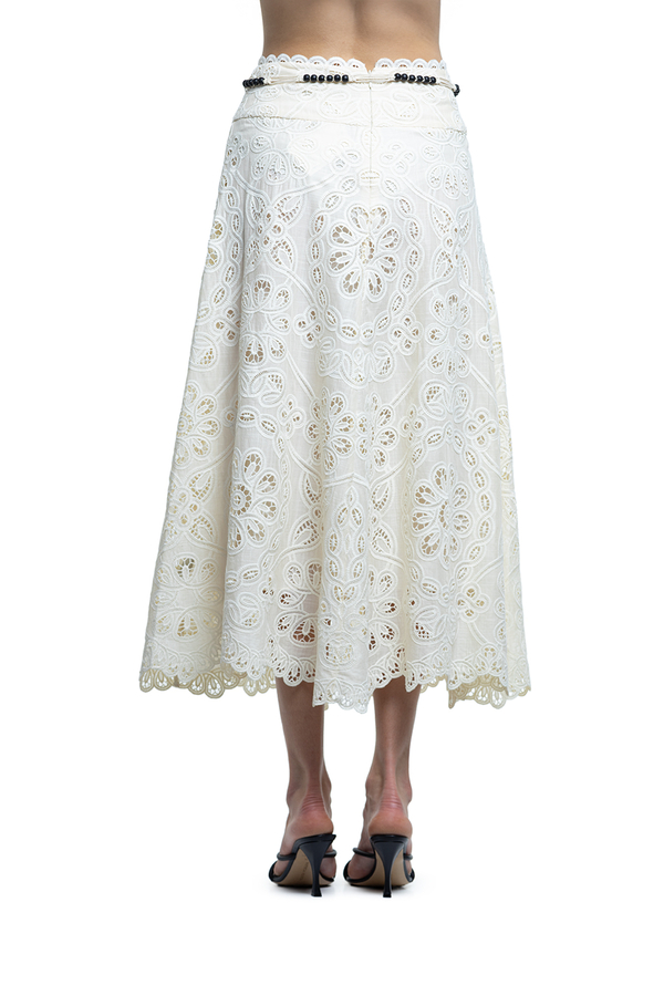 - Embroidered skirt, partially lined, scalloped trim at waistband and hem, detachable belt with wooden beads, concealed back zip fastening
