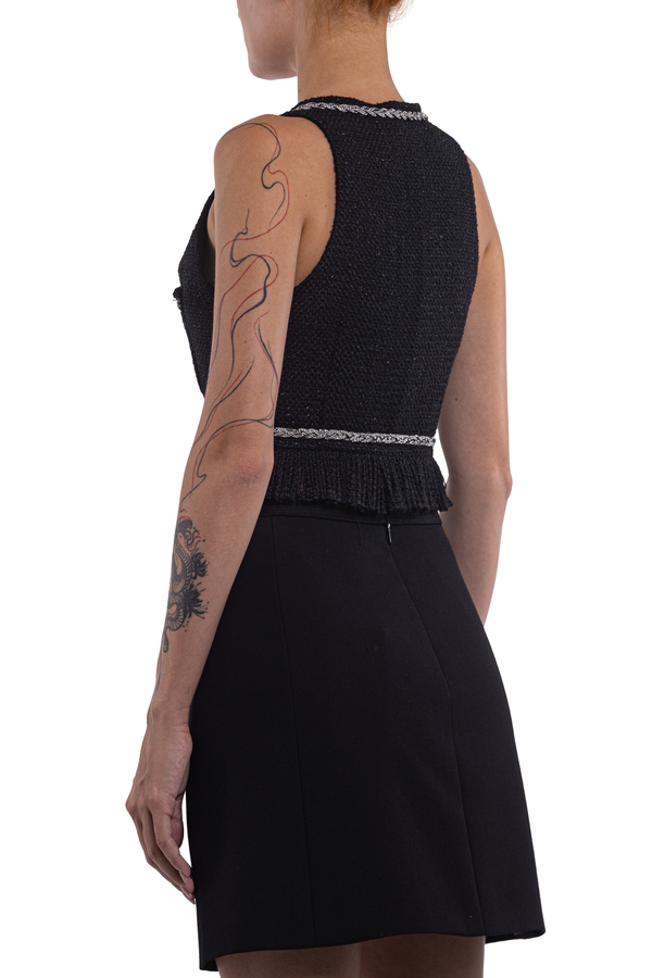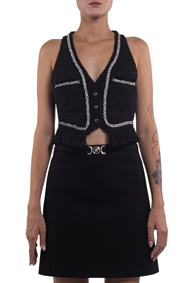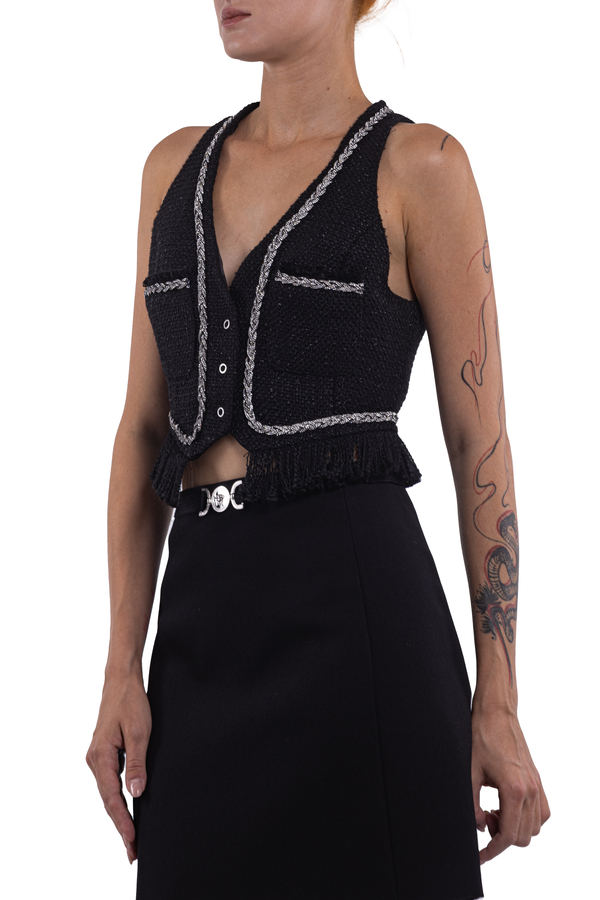 - Sleeveless boucle vest embellished with rhinestones, V-neck, two chest patch pockets, fringed edge, front snap fastening