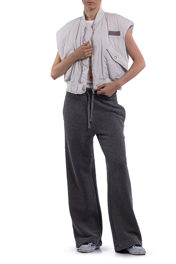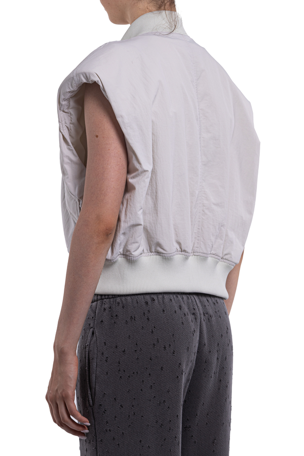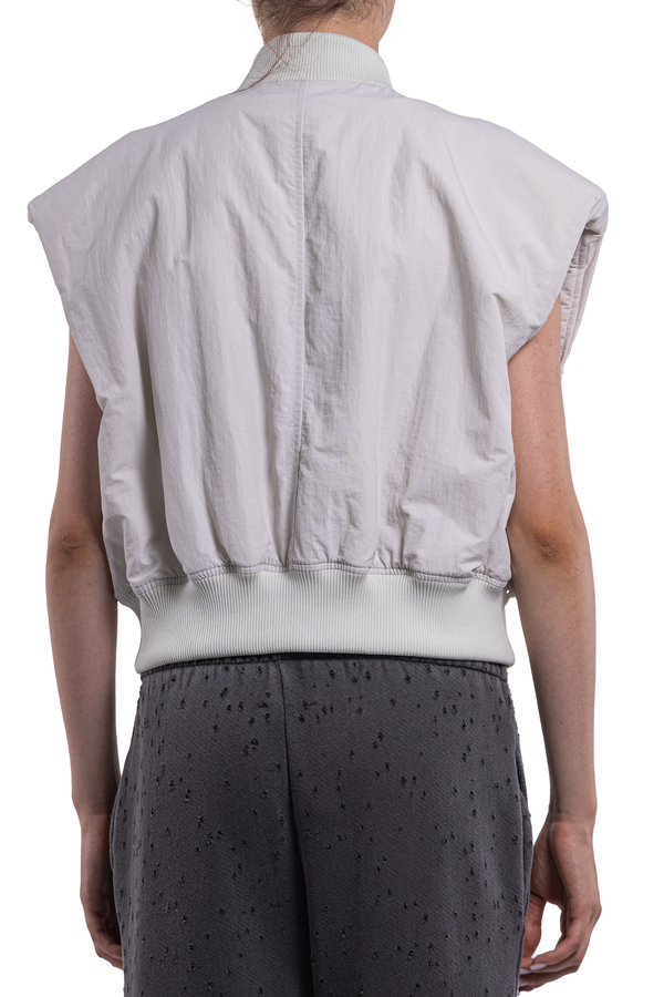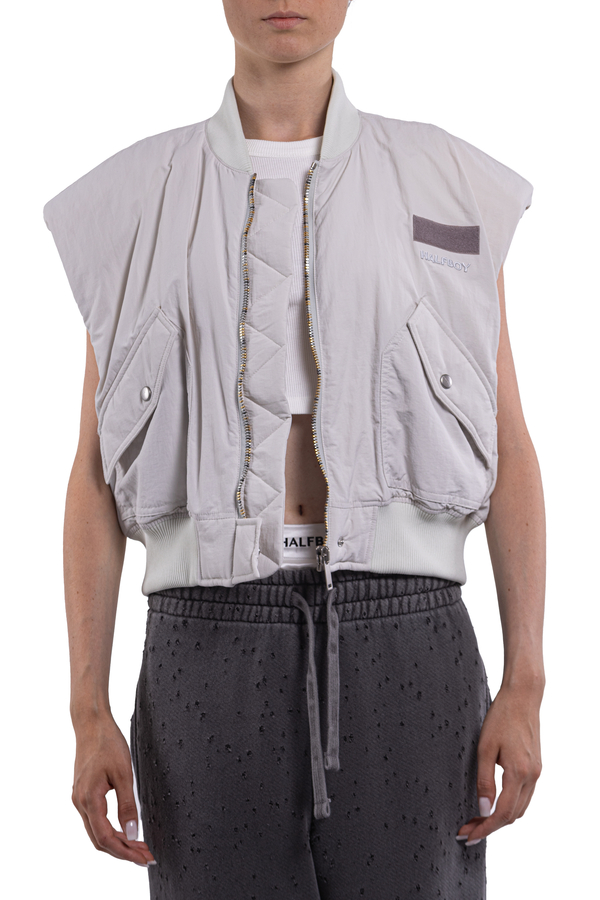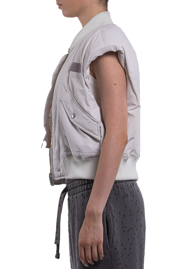 - Vest with elasticated hem and collar, zip and button fastening, two patch pockets with buttons on the front, brand name embroidery on the chest