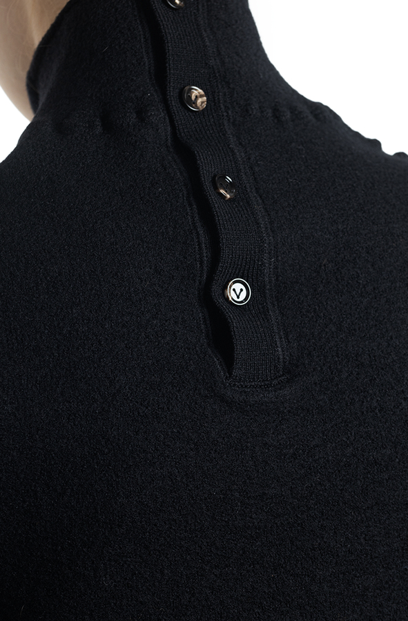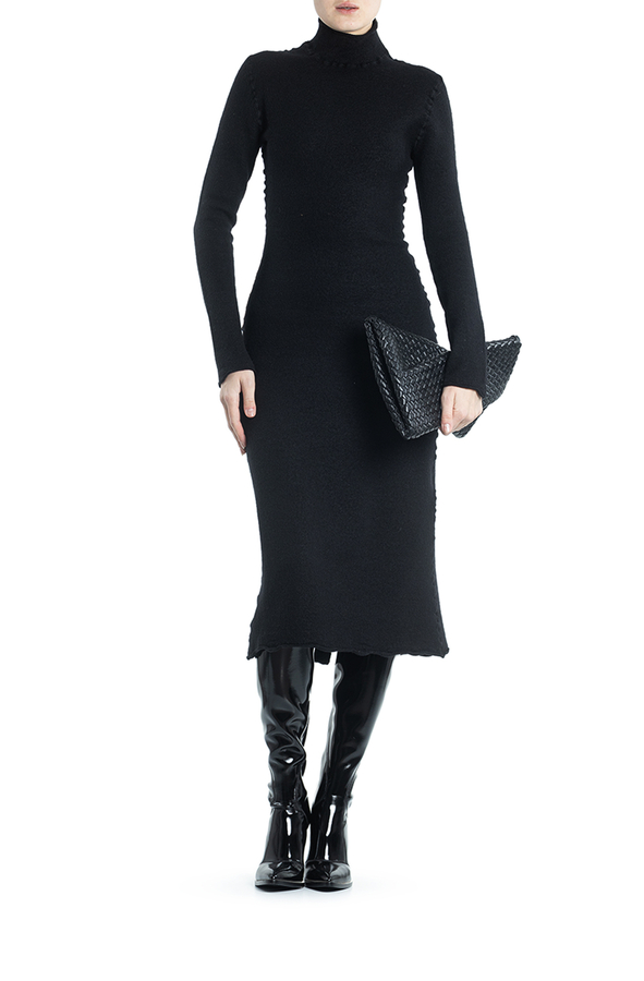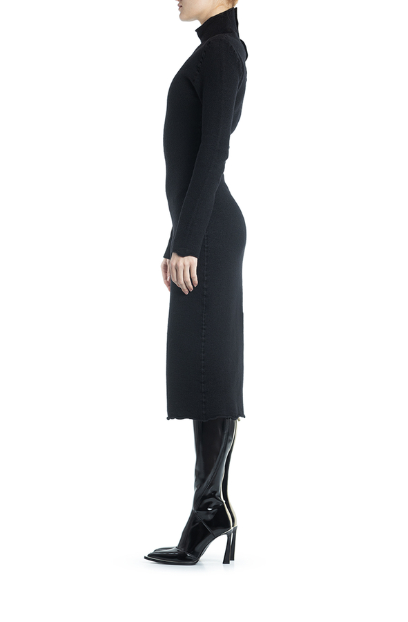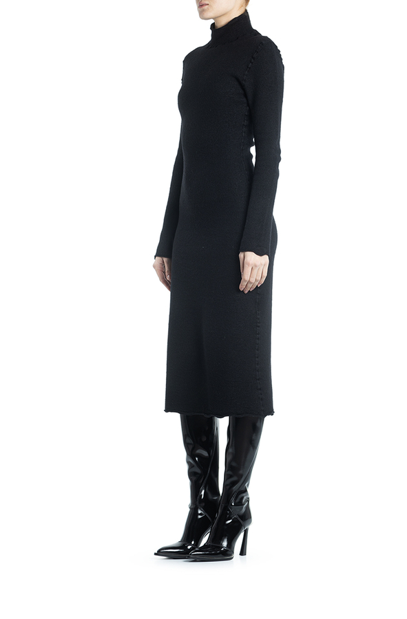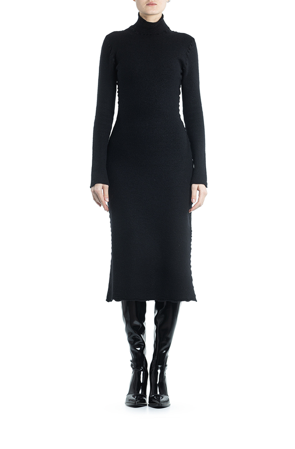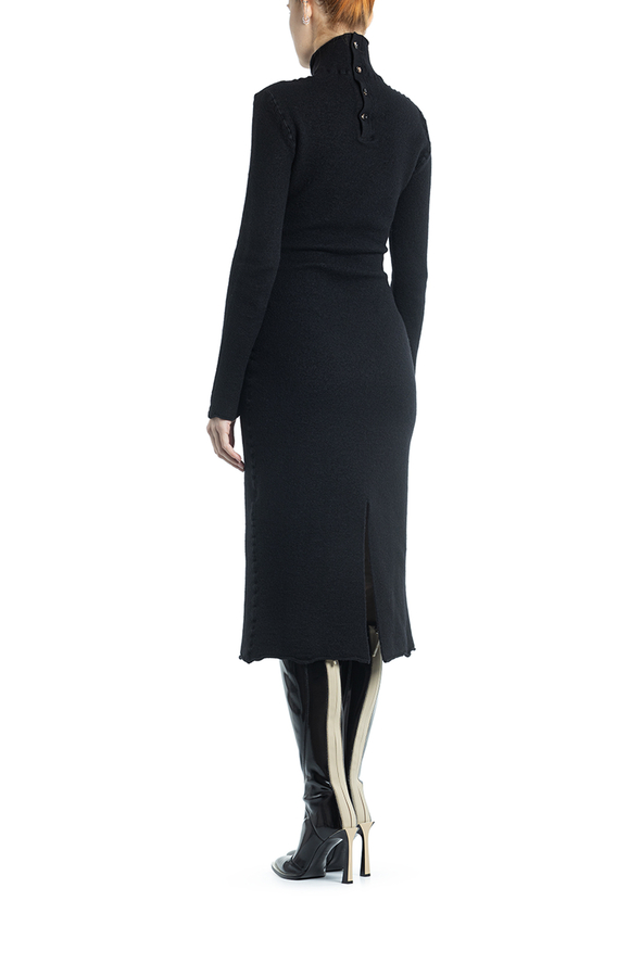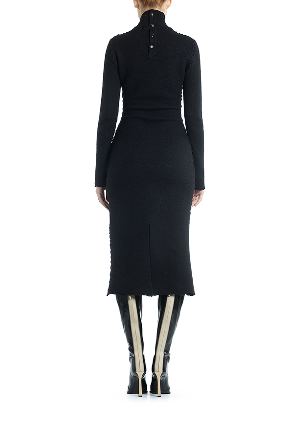 - Fitted dress with a back slit, long sleeves, high collar and button fastening at the back
