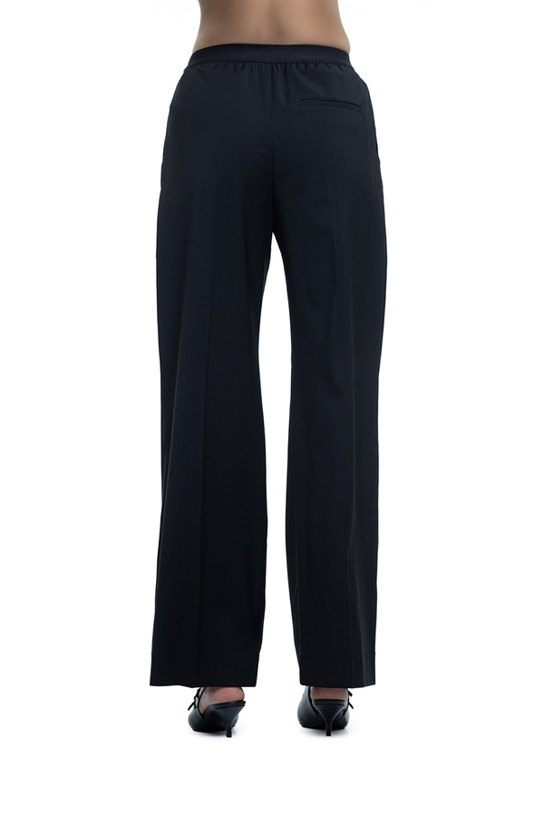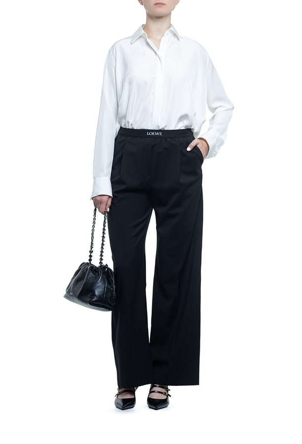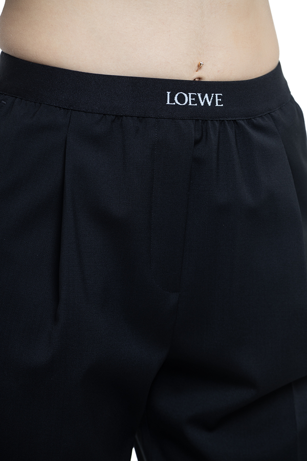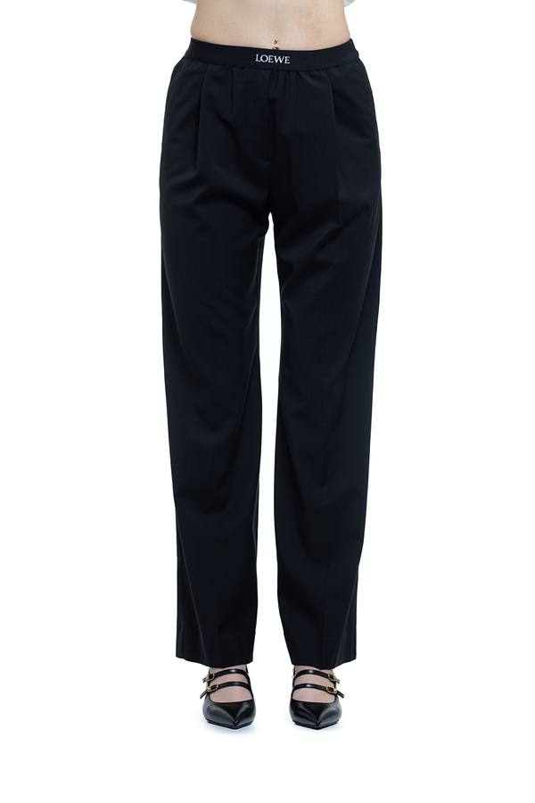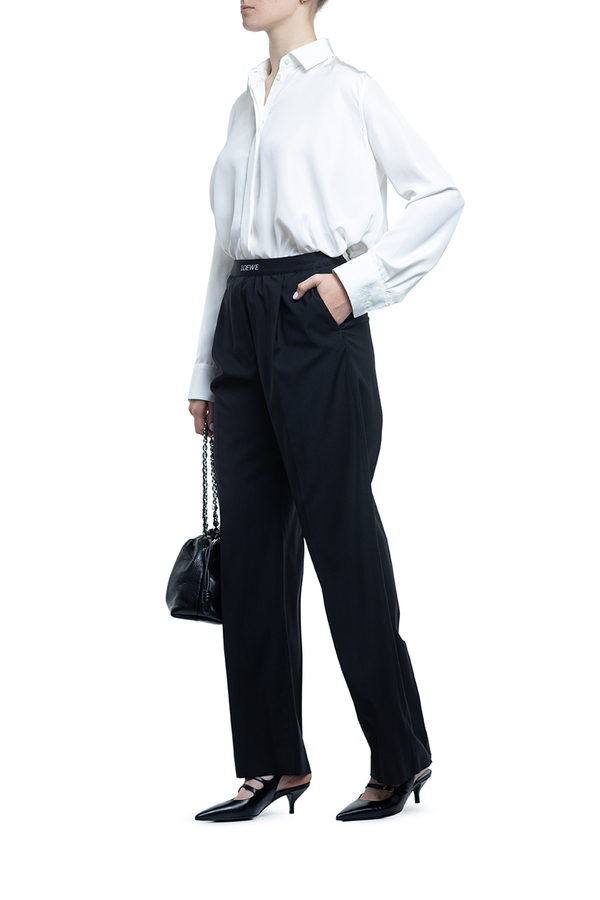 - Relaxed fit trousers with pressed pleats at front and back, elasticated jacquard waistband by Loewe, two slit pockets at the sides and one at the back